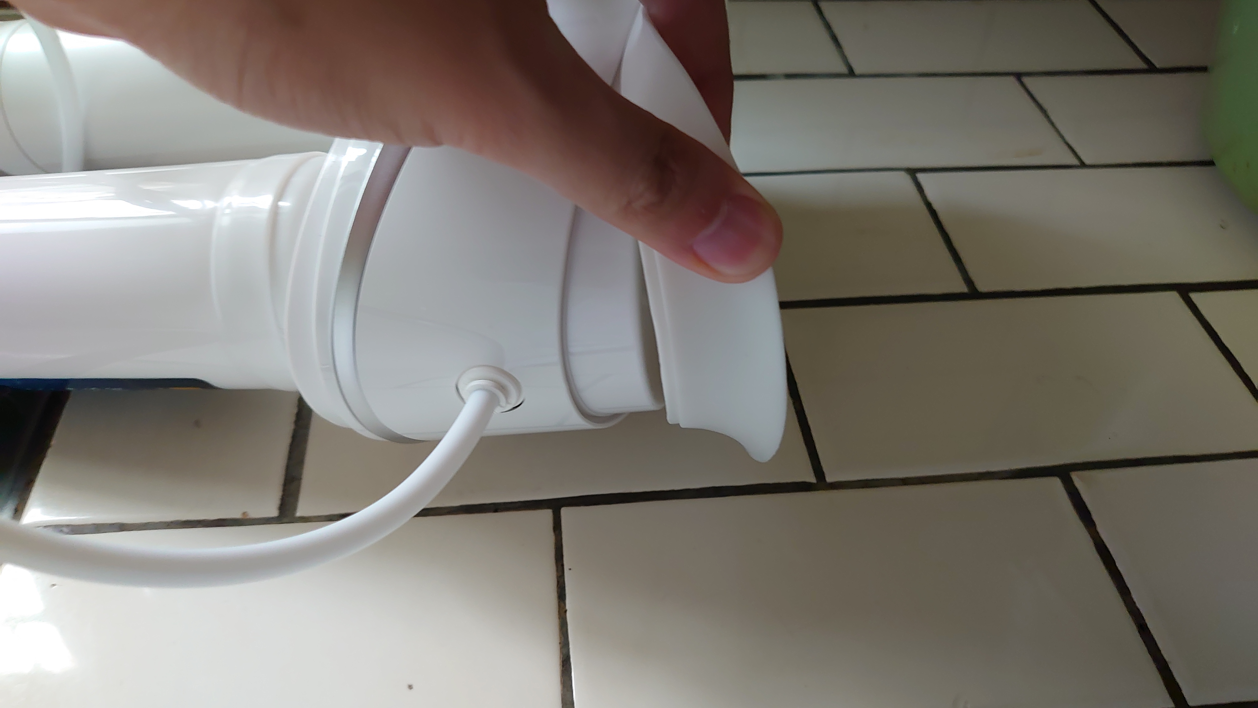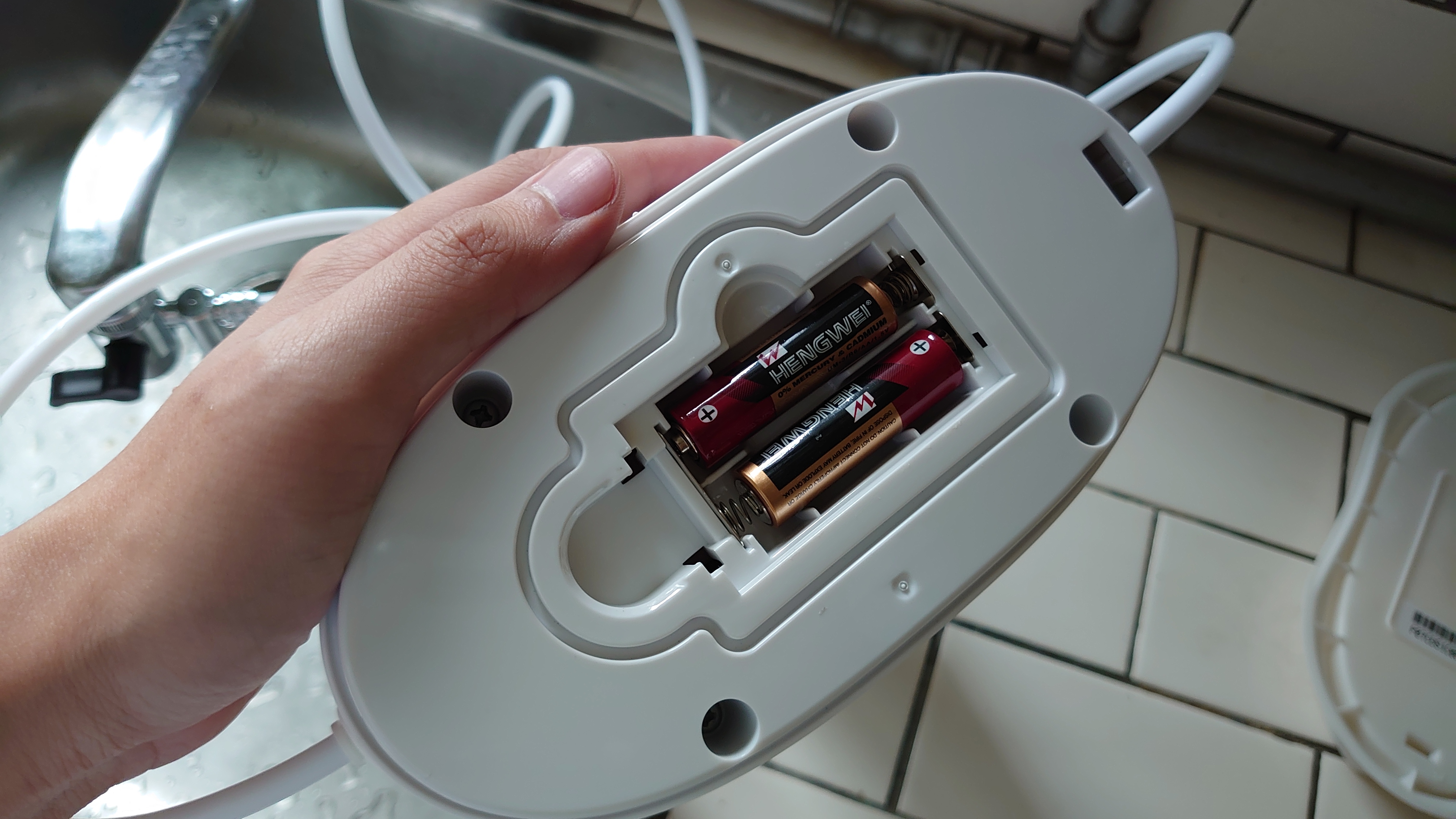裝完水的管路後,接下來把淨水器本體的底座拆開,底座是白色橡膠直接撥開就好,就可以看見有個地方可以裝電池,此款 3M WaterDuo雙效淨水器 具有提醒功能,直接透過 3 號電池來做使用。