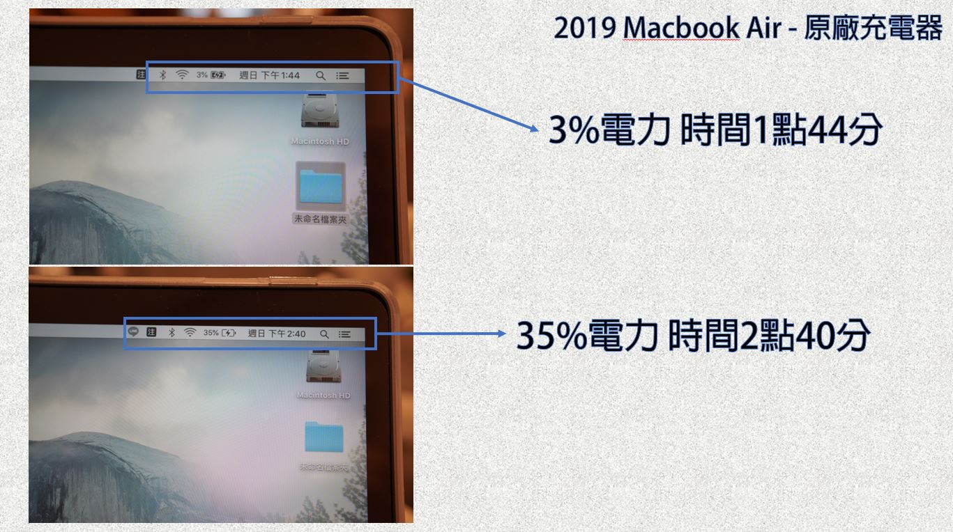 使用 MacBook Air 實際測試,作業上僅做文書應用、音樂軟體播放,用MacBook Air原廠30W充電器,從3%~35%共花費64分鐘。
