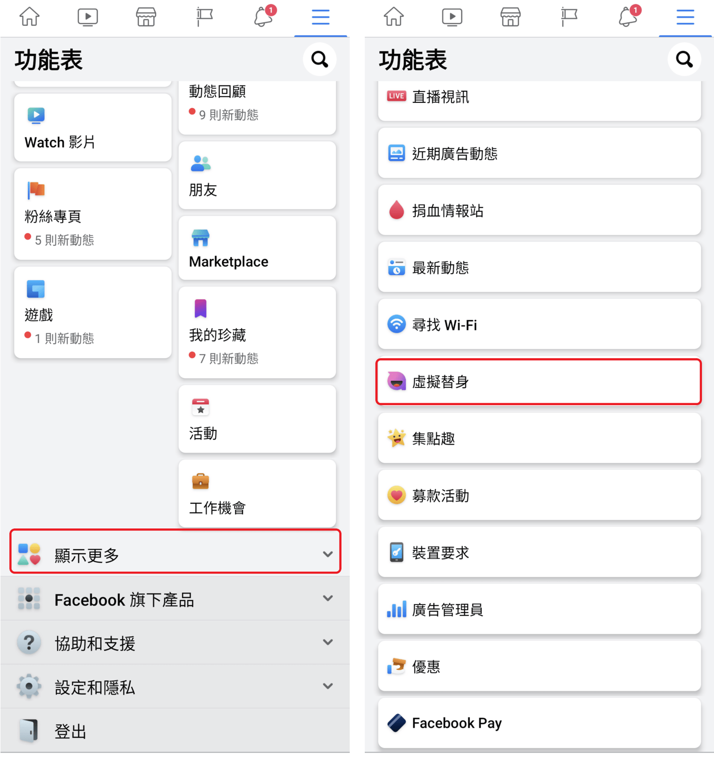 接著往下滑動,找到「顯示更多」點擊下去,就會看見「虛擬替身」的選項。