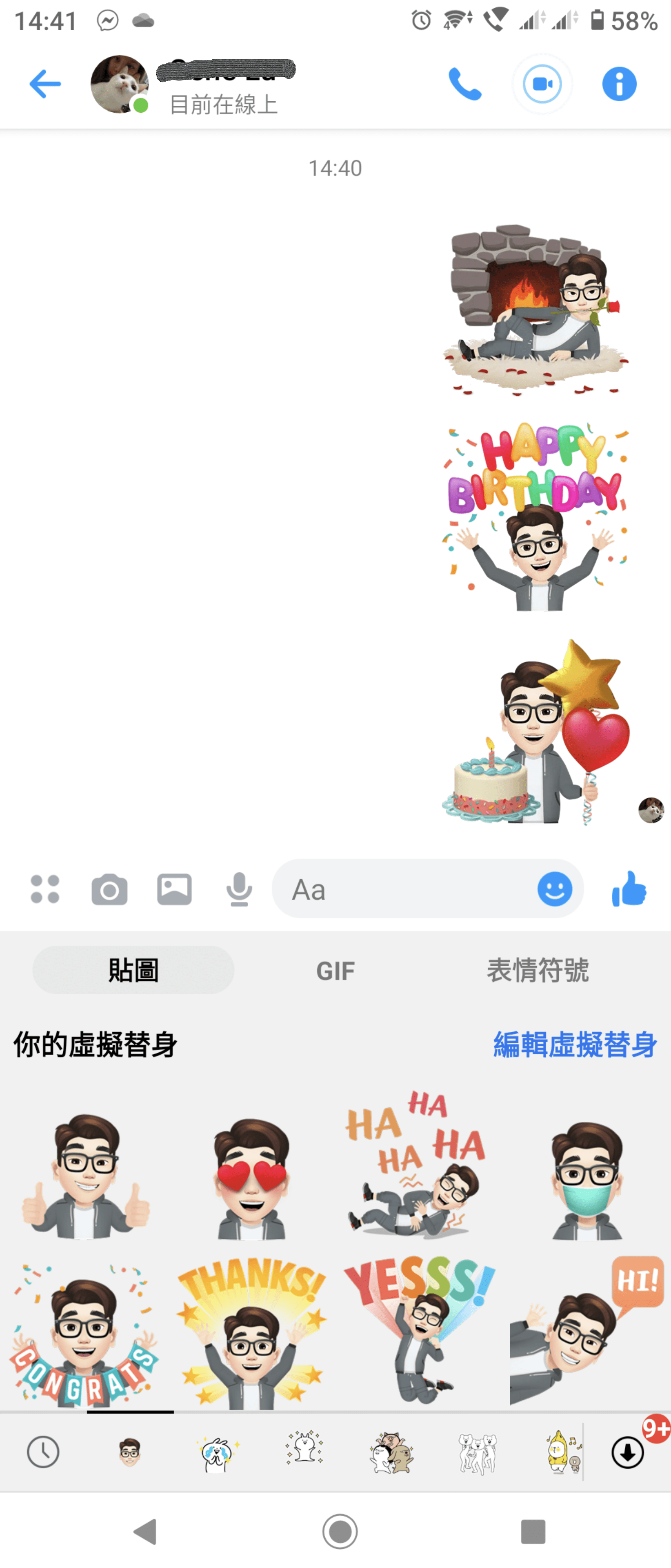 除了Facebook的發文可以使用之外,他還會透過你製作的「虛擬替身」幫你製作出一套常用的生活貼圖,讓你在與人使用 Messeng 聊天也能快速做使用。