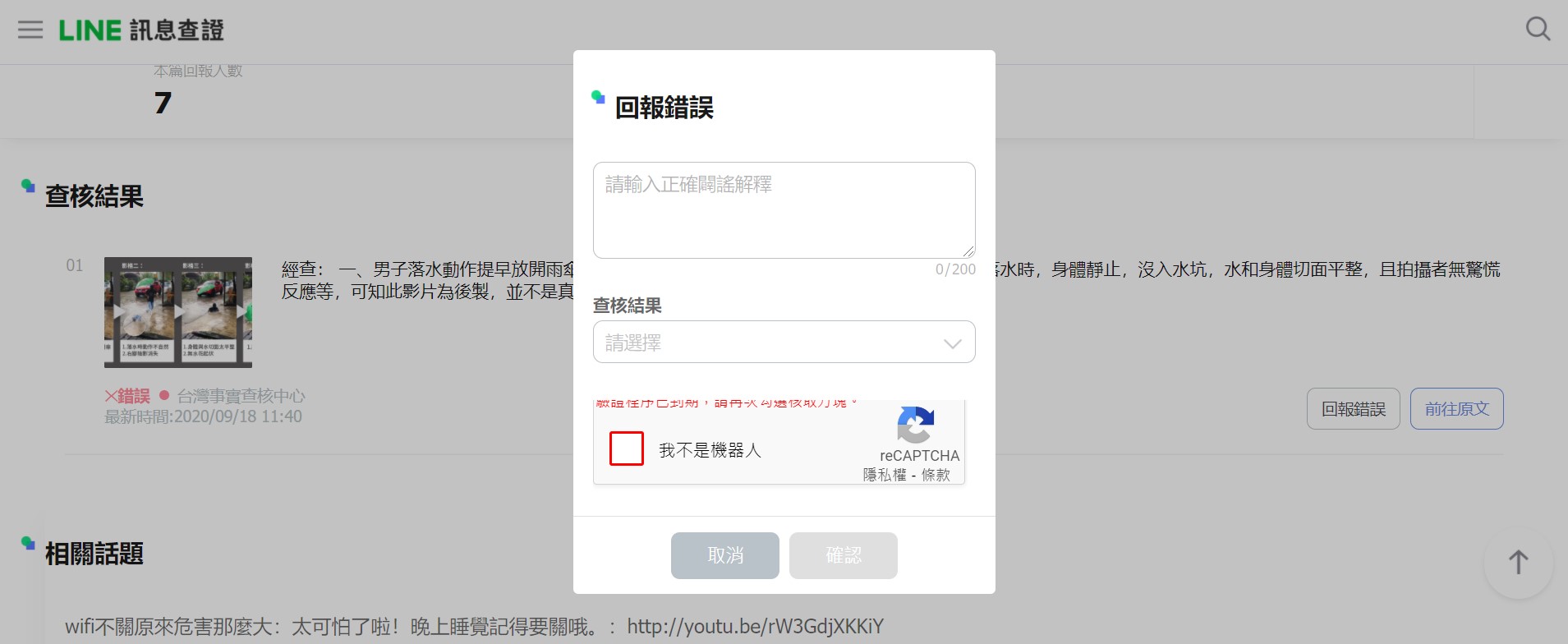如果你看到有不實的新聞,你也可以成為正義鄉民為社會盡一份心力,糾正不實新聞。回報錯誤也有防止機器人機制,資訊傳出會提供給LINE查核合作夥伴(MyGoPen、真的假的 Cofacts、蘭姆酒吐司、台灣事實查核中心)
