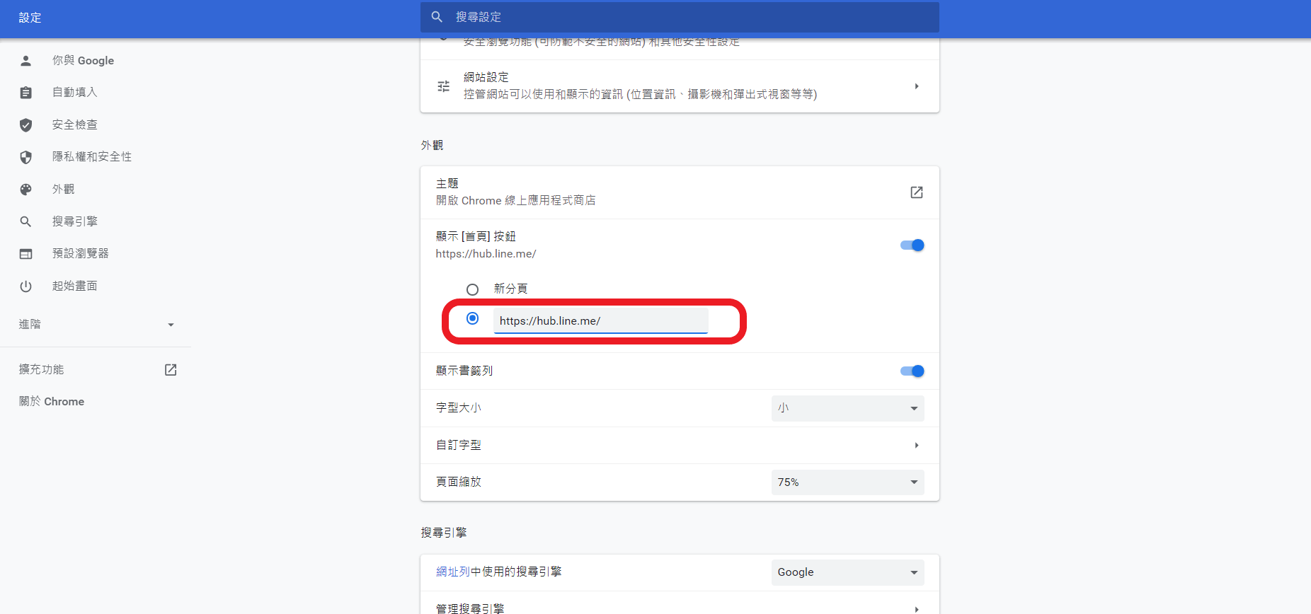 這樣點選Google Chrome的首頁時就能透過此處回到LINE HUB。