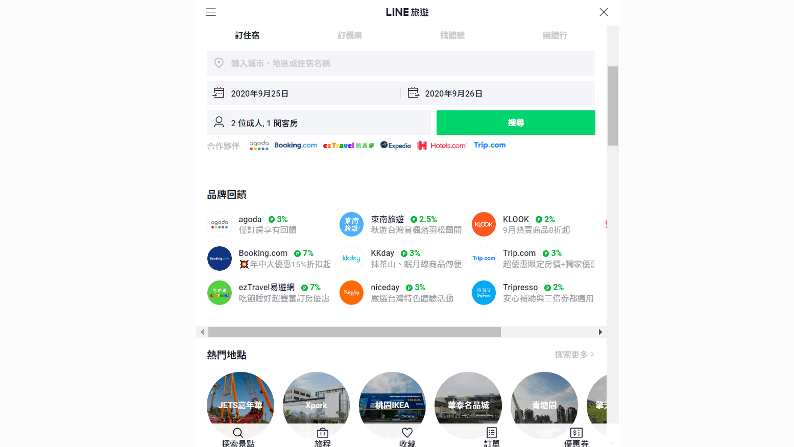 LINE 與各大訂房網站及旅行社合作,除上述網站訂房優惠之外,LINE 還有 LINE POINTS 回饋點數,同等現金回饋1點就能換1元折抵,有些回饋比銀行信用卡的現金回饋還要補,出遊靠 LINE 旅遊 多少能幫忙省點旅費回來。