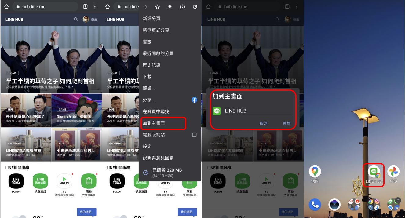 Android手機可以透過內建的Google Chrome瀏覽器,在網址輸入「https://hub.line.me/」,接著透過右上方的設定按鍵,看見加到主畫面,確認完成後即可在桌面上直接看到 LINE HUB。