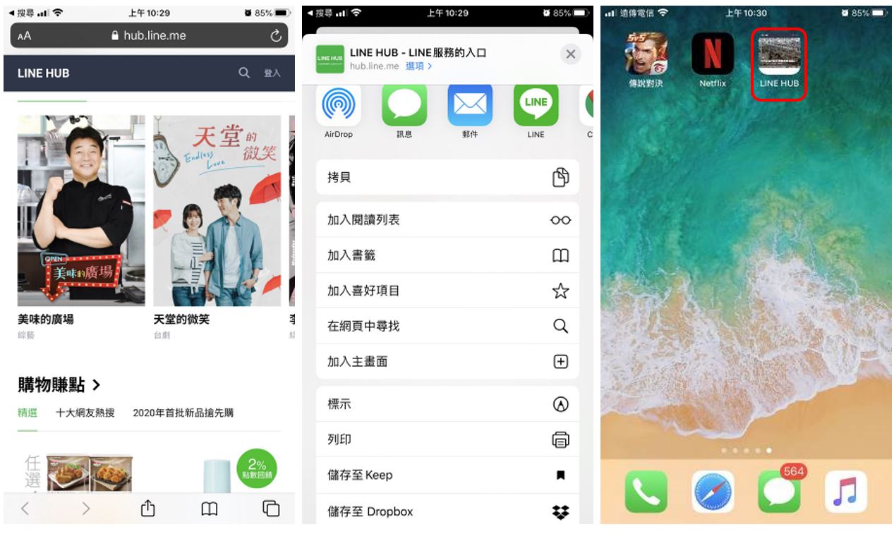 Apple手機用戶可以直接開啟Safari,在網址輸入「https://hub.line.me/」,並點下方的分享鈕,選「加入主畫面」,即完成。
