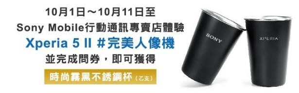2020/10/1至10/11止親自到全台Sony Mobile行動通訊專賣店,就能搶先體驗Xperia 5 II嶄新功能,現場體驗並完成問券,即可獲得「時尚霧黑不鏽鋼杯」一只(數量有限送完為止)。