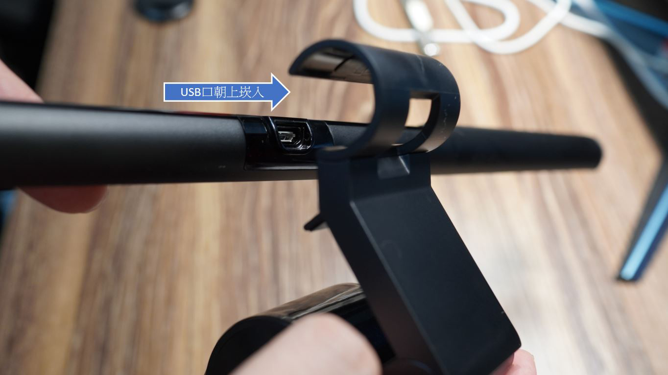 使用上很簡單,先拿起 ScreenBar 並且將USB口朝上往 Clip夾具 崁入。