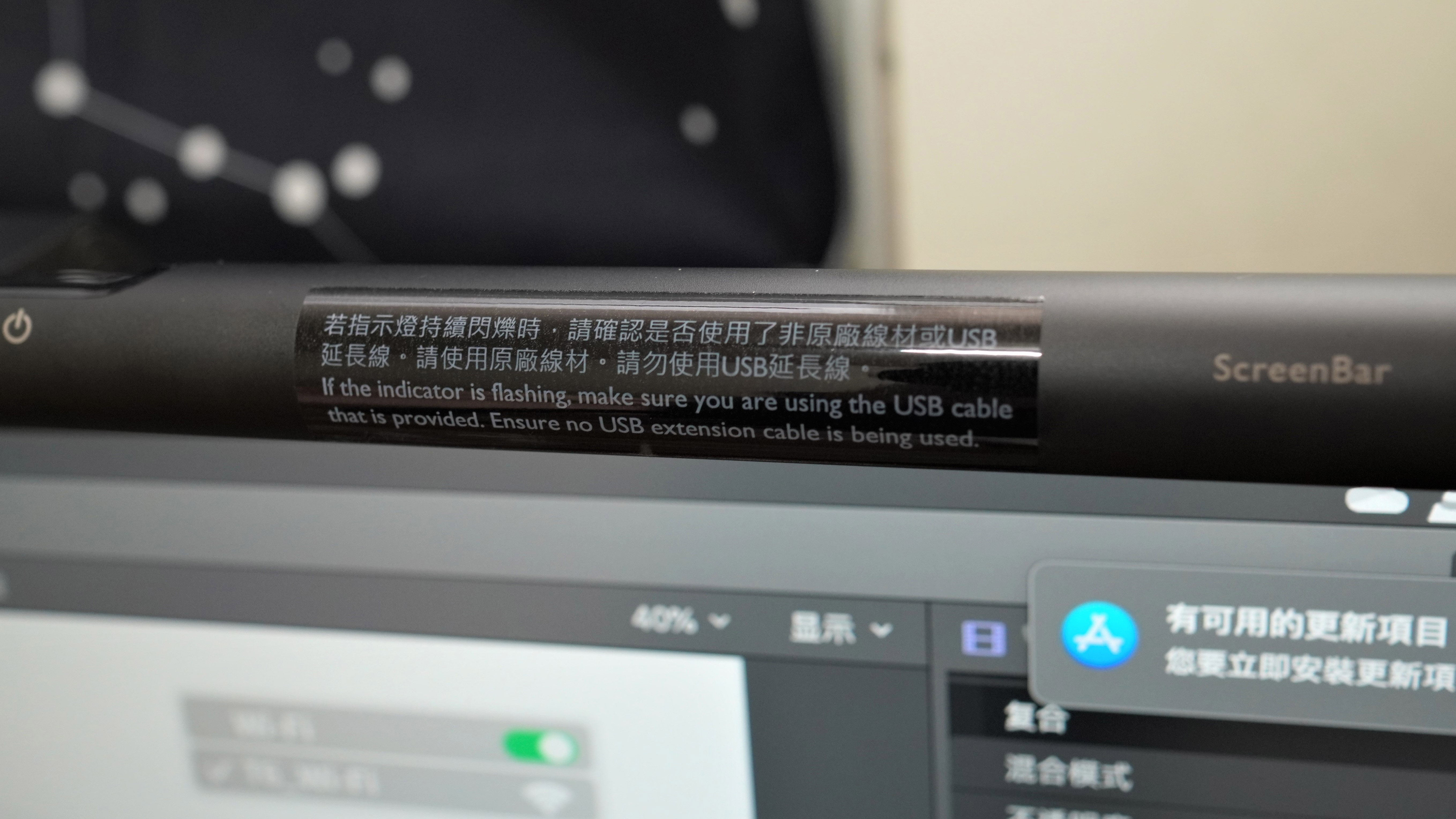 而 BenQ 原廠特別註記如果碰到 ScreenBar 指示燈持續閃爍時,先檢查是否使用原廠USB供電線材,請勿使用USB延長線,避免供電不穩的狀況發生。