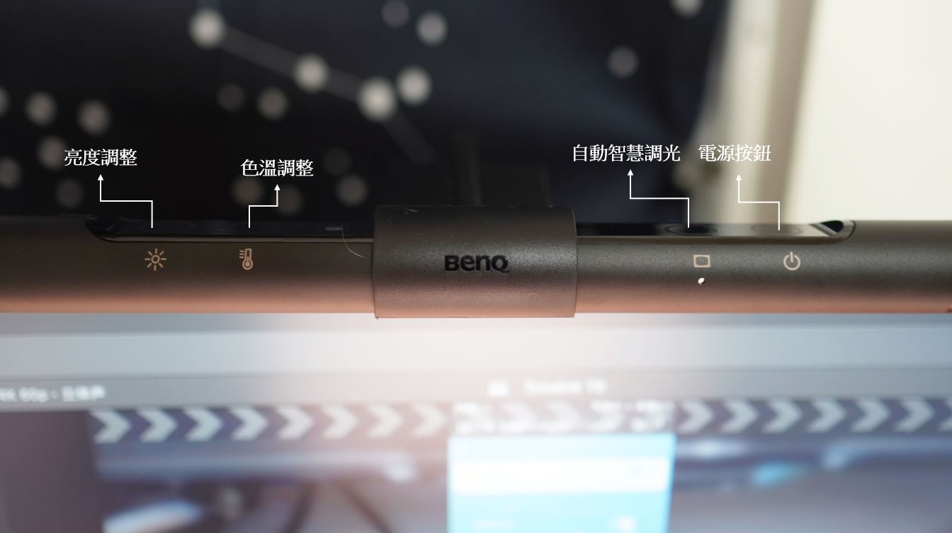 輕輕碰一下電源按鈕上方黑色處 BenQ ScreenBar 就會發光,上方的控制鈕都是做「觸控式」的,整體質感提升一個檔次。