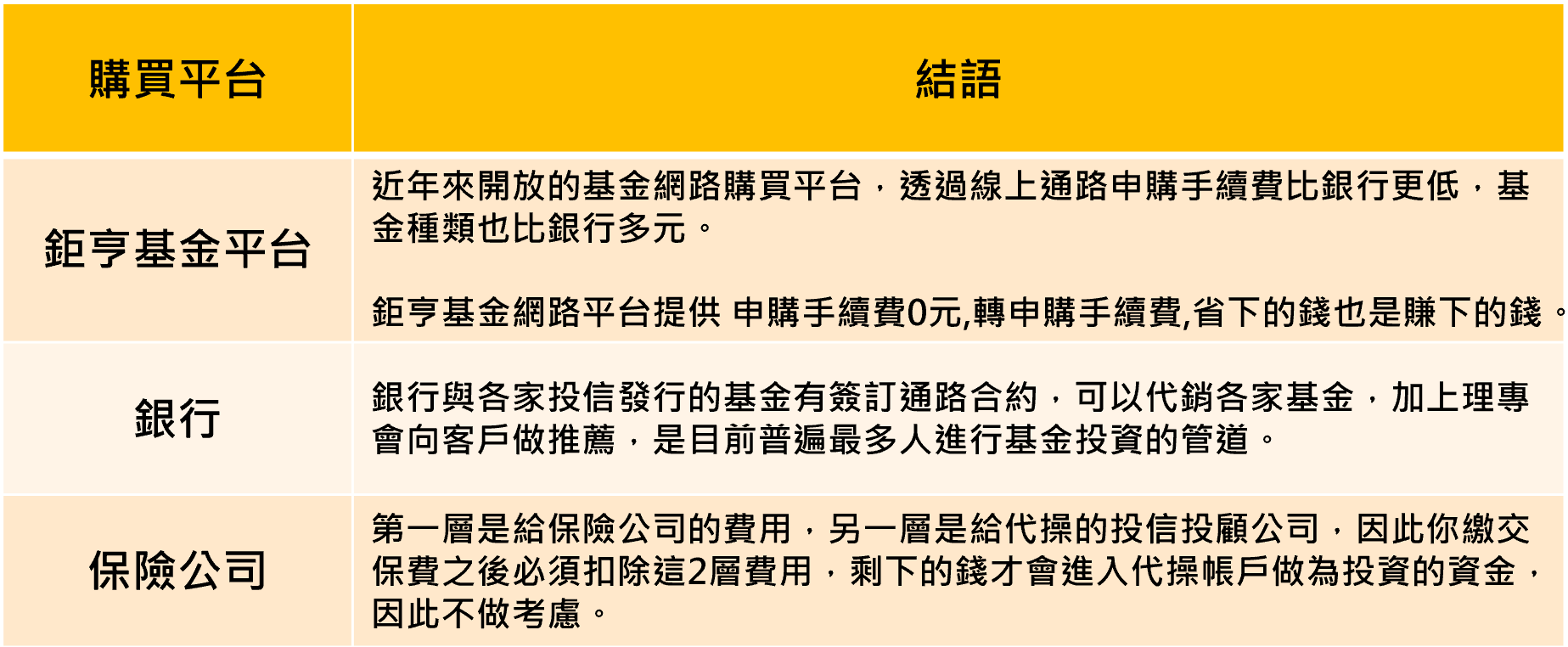 透過上圖叔叔把經驗作為分析,大家購買的基金的方式分為 銀行 及 保險 兩種,這兩種手續費的收取也是不少,相對透過網路基金購買平台來操作則會省下不少手續費用,尤其 鉅亨基金平台 還提供現在 新戶申請基金申購0元手續費的福利。