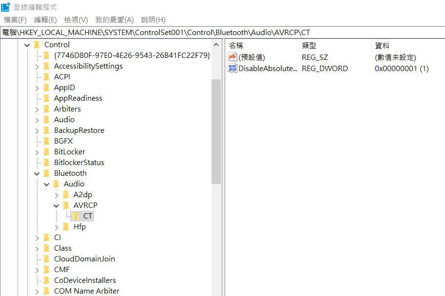找到進入路徑:電腦→ HKEY_LOCAL_MACHINE→ SYSTEM→ ControlSet001→ Control→ Bluetooth→ Audio→ AVRCP→ CT