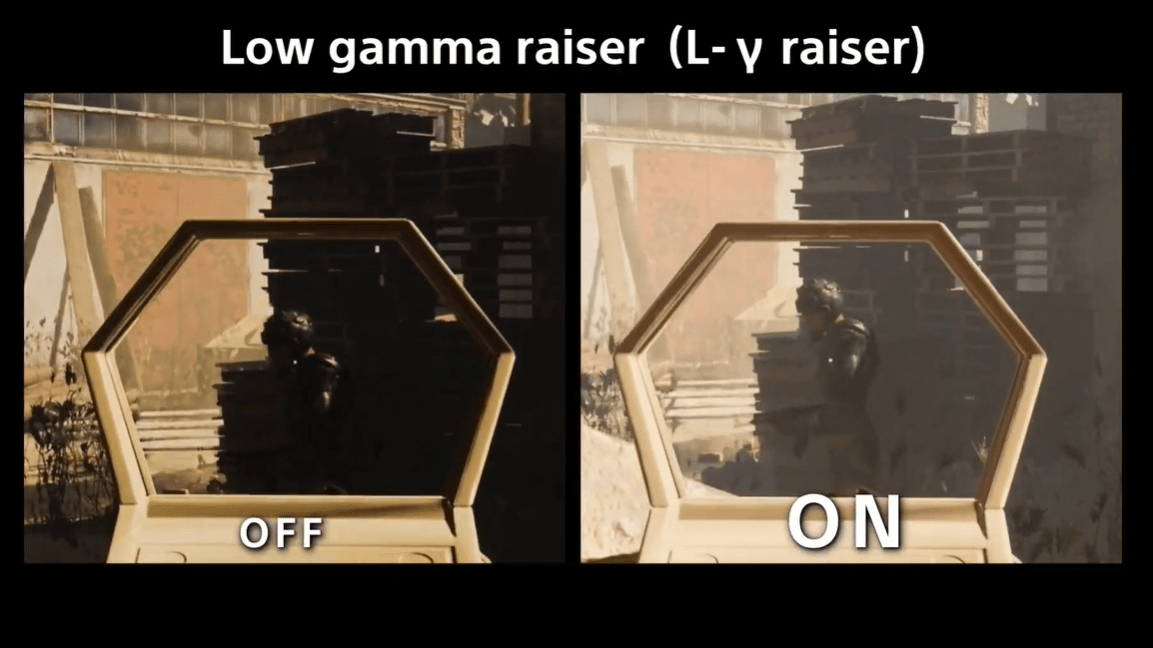 最新L-γ raiser (low gamma raiser) 深色背景強化,能改善畫面暗處的影像細節,同時避免亮處過曝,因此玩家能更容易發現藏匿在暗處的敵人。