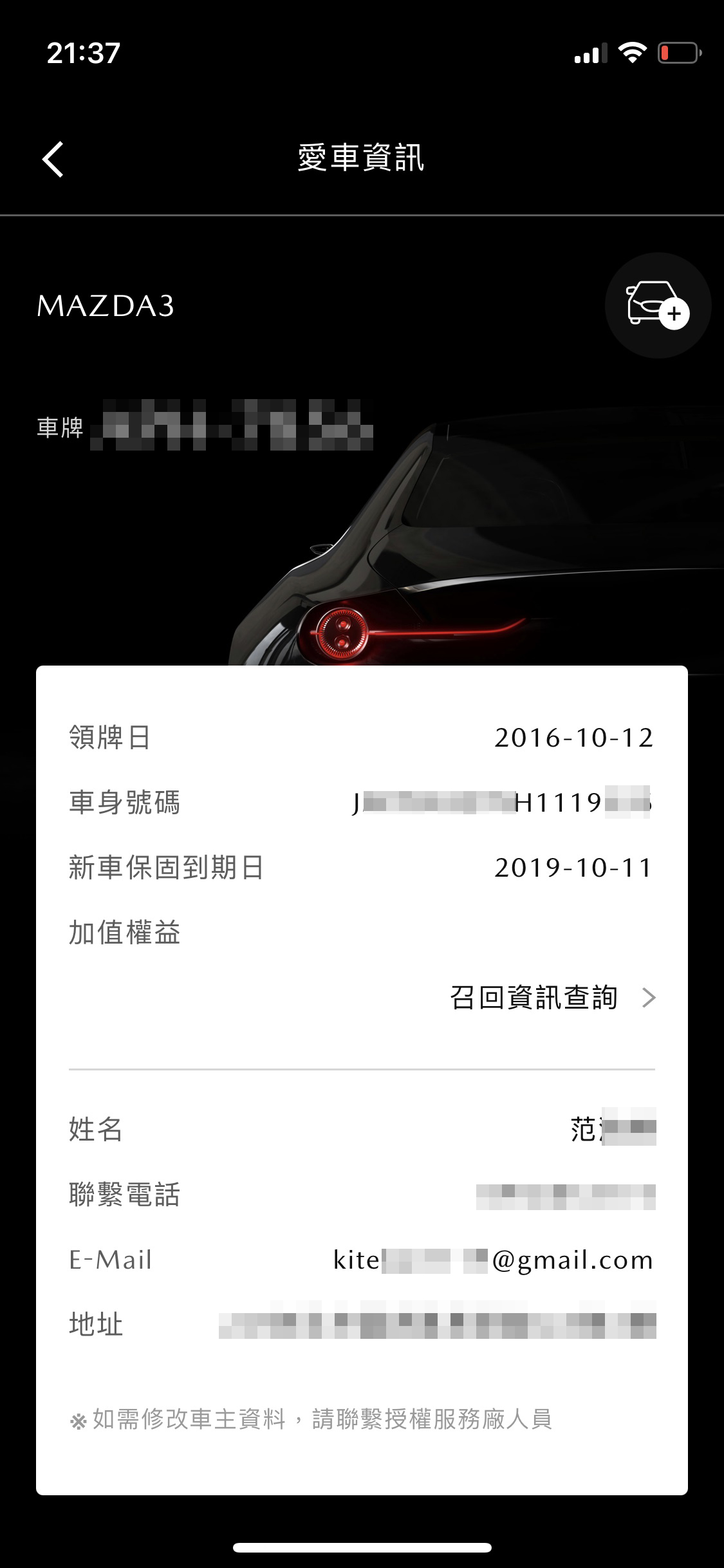 包含畫面中有個「召回資訊」,當車廠官方有要做車輛召回以往只有信件掛號通知,但是現在很多人住的地方不一定會跟當時車籍資料留的是同一個地址,因此想要有原廠提供的一手資訊,這個app就能發揮不錯的功用。