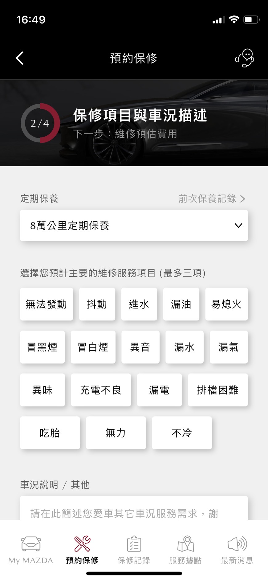 預約保養的資料填寫時,有那些需要檢查的項目也可以先填寫,包含車況其他部分可以做影片上傳提供(例如:後照鏡收折問題),可以讓技師在車況保修判斷上有所幫助。