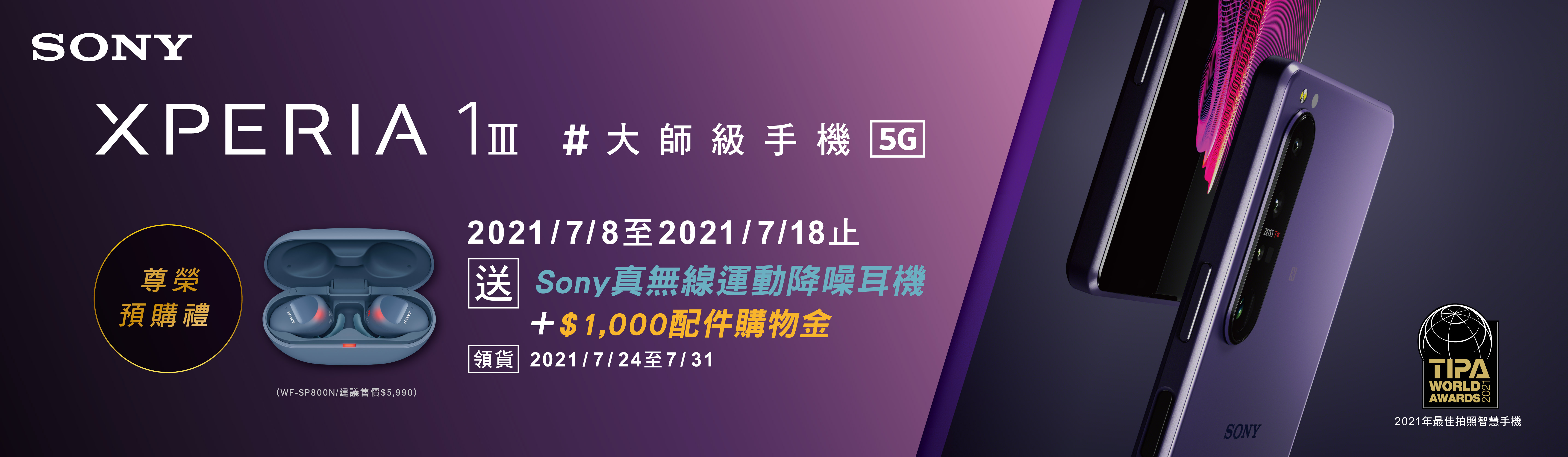 自2021年7月8日至2021年7月18日止,至Sony Mobile行動通訊專賣店、Sony 直營店,以及線上通路包含: Sony台灣官方購物網站、PChome購物、Yahoo奇摩購物中心、Momo購物網、蝦皮購物(Sony 官方授權旗艦店)、神腦線上、friDay 購物等指定店家及通路,搶先預購Xperia 1 III即可獲得Sony真無線運動降噪耳機(WF-SP800N,市價5,990元),還可獲得1,000元配件購物金或配件購物組!