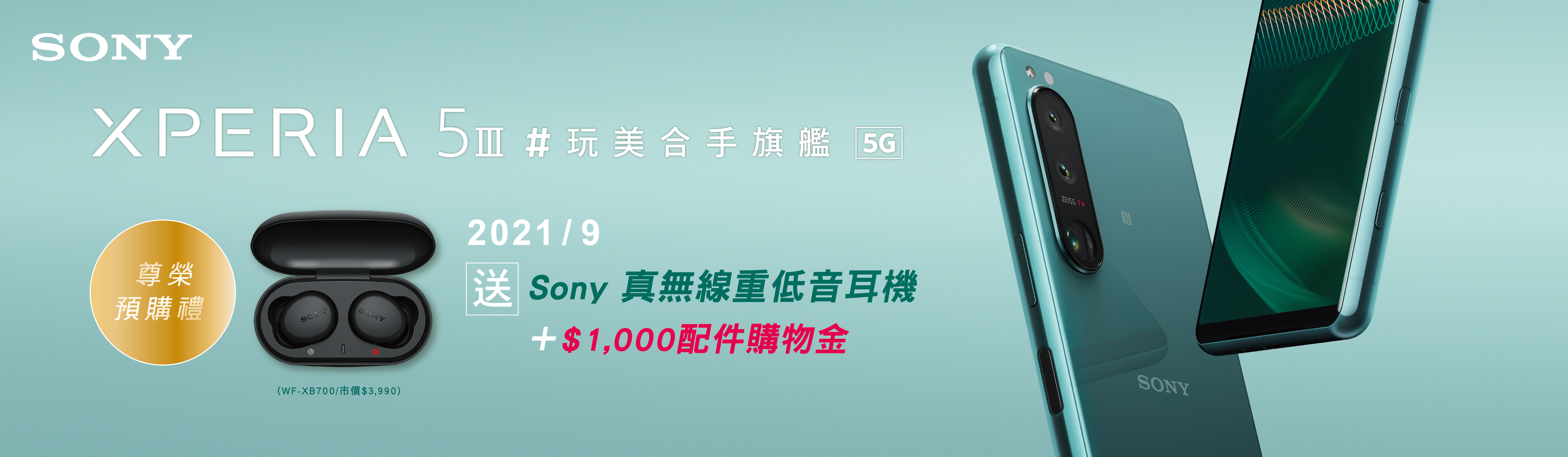 Xperia 5 III預購活動,將於後續公布活動開始時間,於指定通路預購Xperia 5 III手機,將可獲得Sony真無線運動重低音耳機(WF-XB700,市價3,990元) 以及1000配件購物金或配件購物組。
