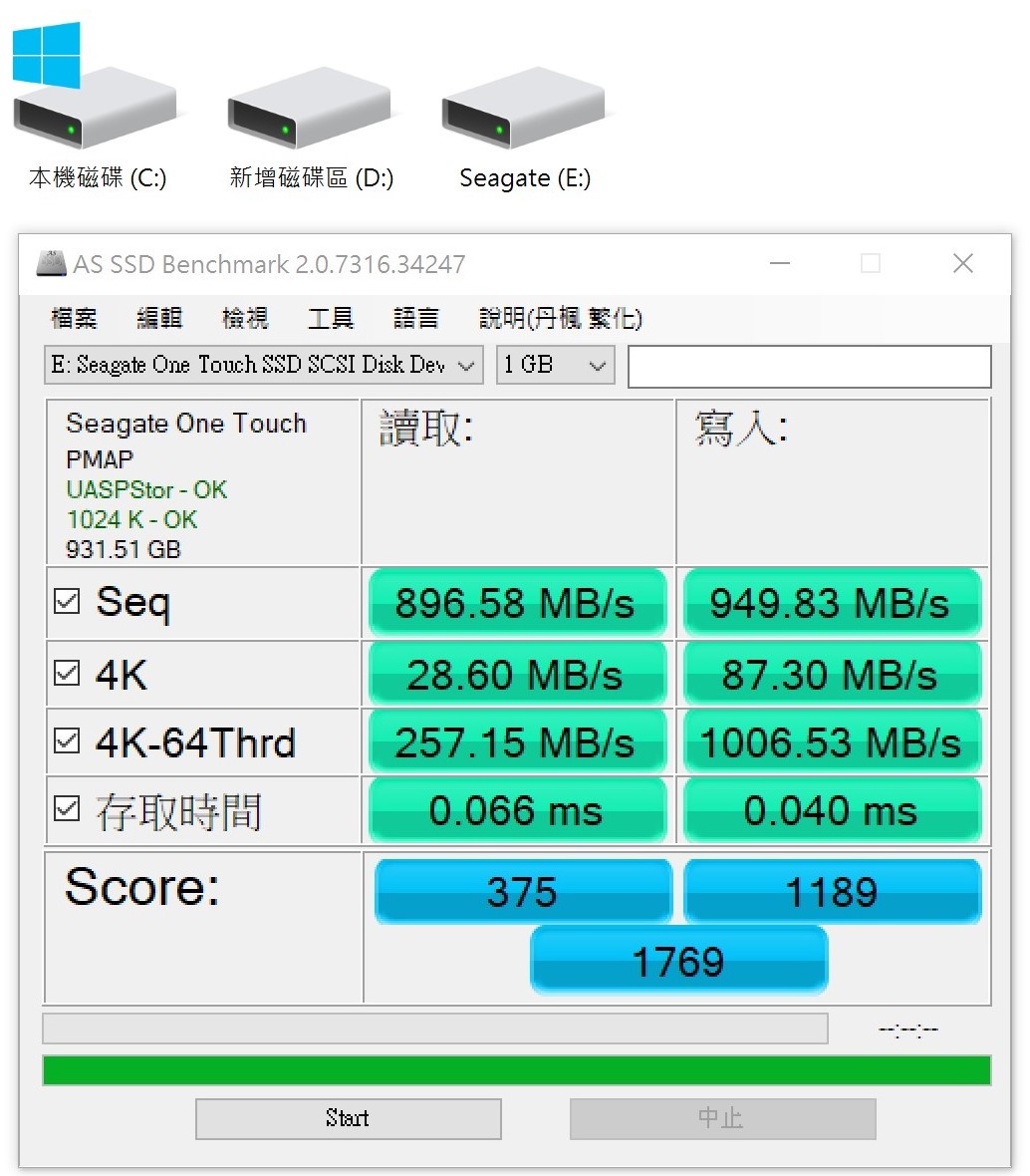第二組測試軟體為預設模式,Windows作業系統下測試得到上圖數據,讀取896.58MB/s,寫入949.83MB/s。