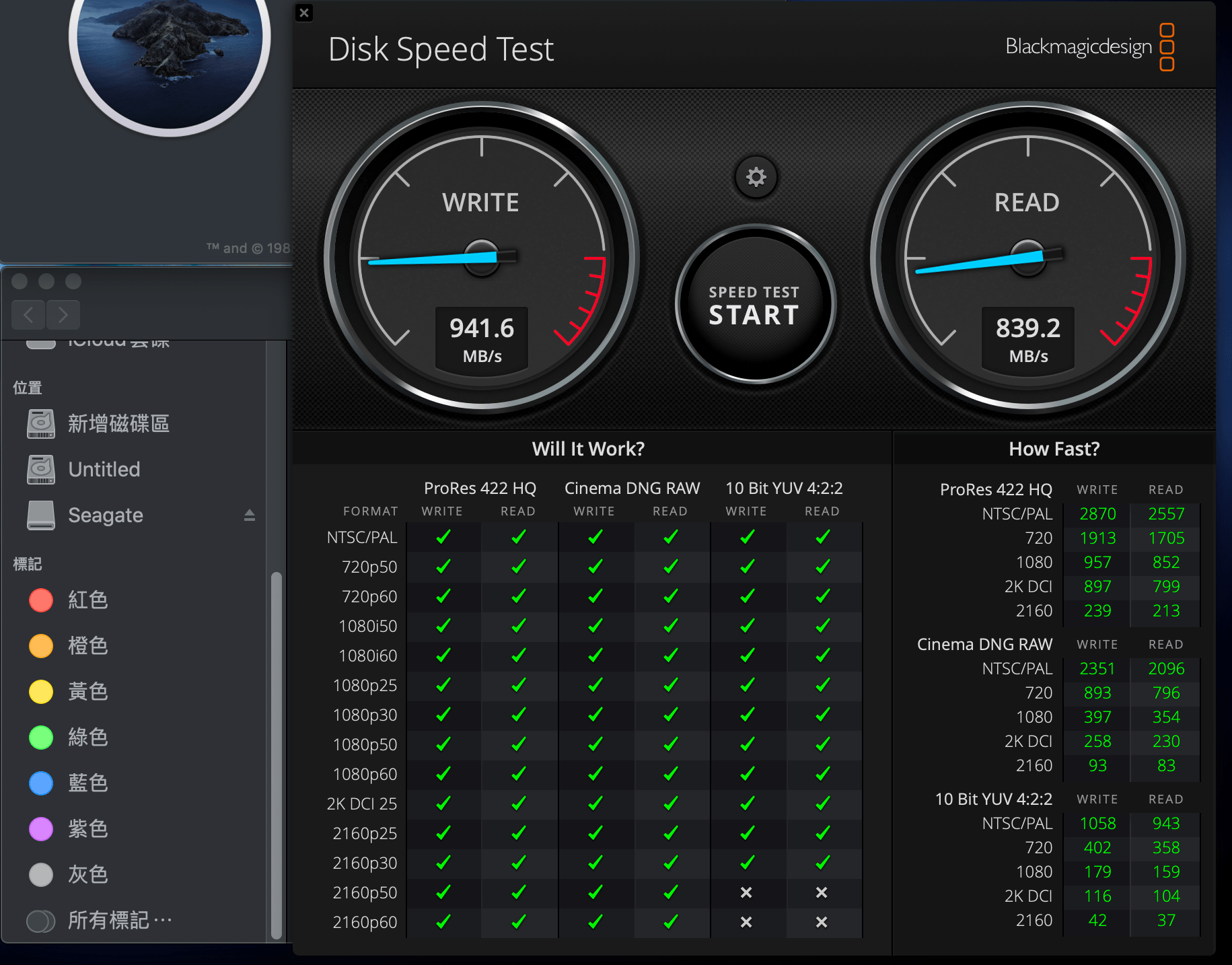 接著到蘋果的macOS作業系統下測試, 測試軟體為預設模式, 讀取839.2MB/s,寫入941.6MB/s。
