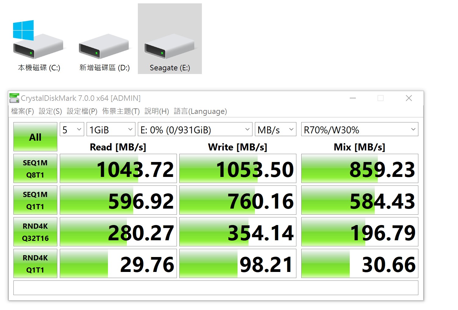 測試軟體為預設模式,Windows作業系統下測試得到上圖數據,讀取1043.72 MB/s,寫入1053.50 MB/s,混合讀寫 859.23 MB/s。