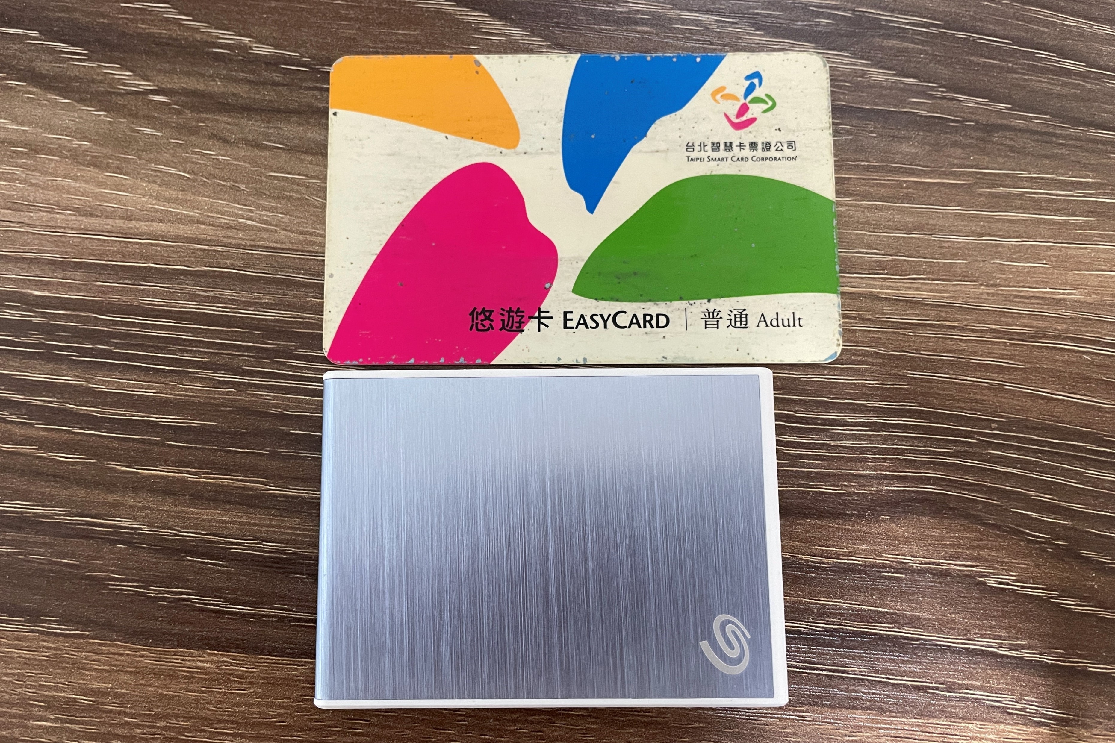 One Touch SSD 外觀為金屬髮絲紋、側邊為織紋布料,面積長7cm、寬5cm比一張悠遊卡還小,厚度也只有1.06公分與74公克的重量,除此之外還具備2公尺的防摔防撞能力,放在口袋內隨身攜帶也能很放心。