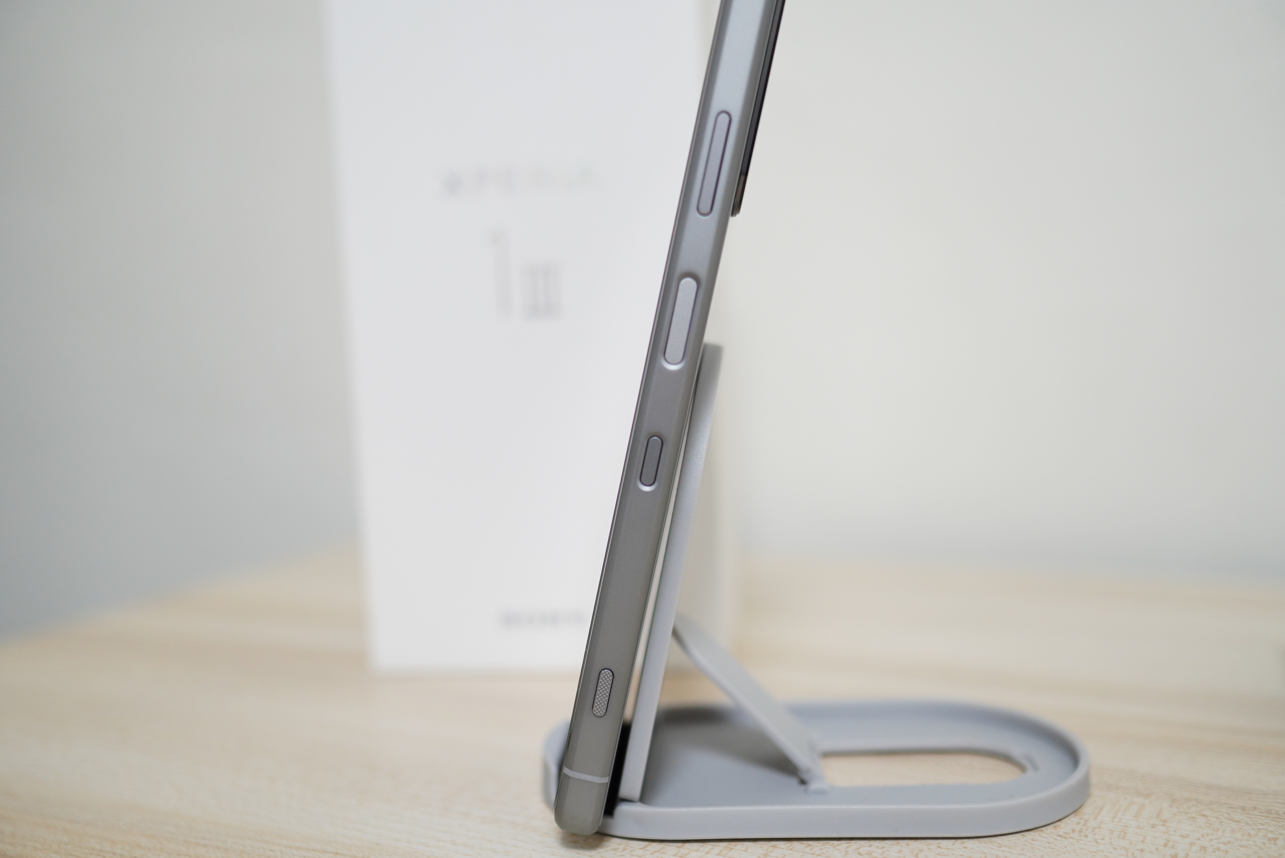 Xperia 1 III背面設計使用睽違已久的霧面玻璃設計,實際摸起來的手感還不錯,不易附著油汙及指紋是一項不錯的優點,不論是哪一個配色皆是霧面消光色為主軸。