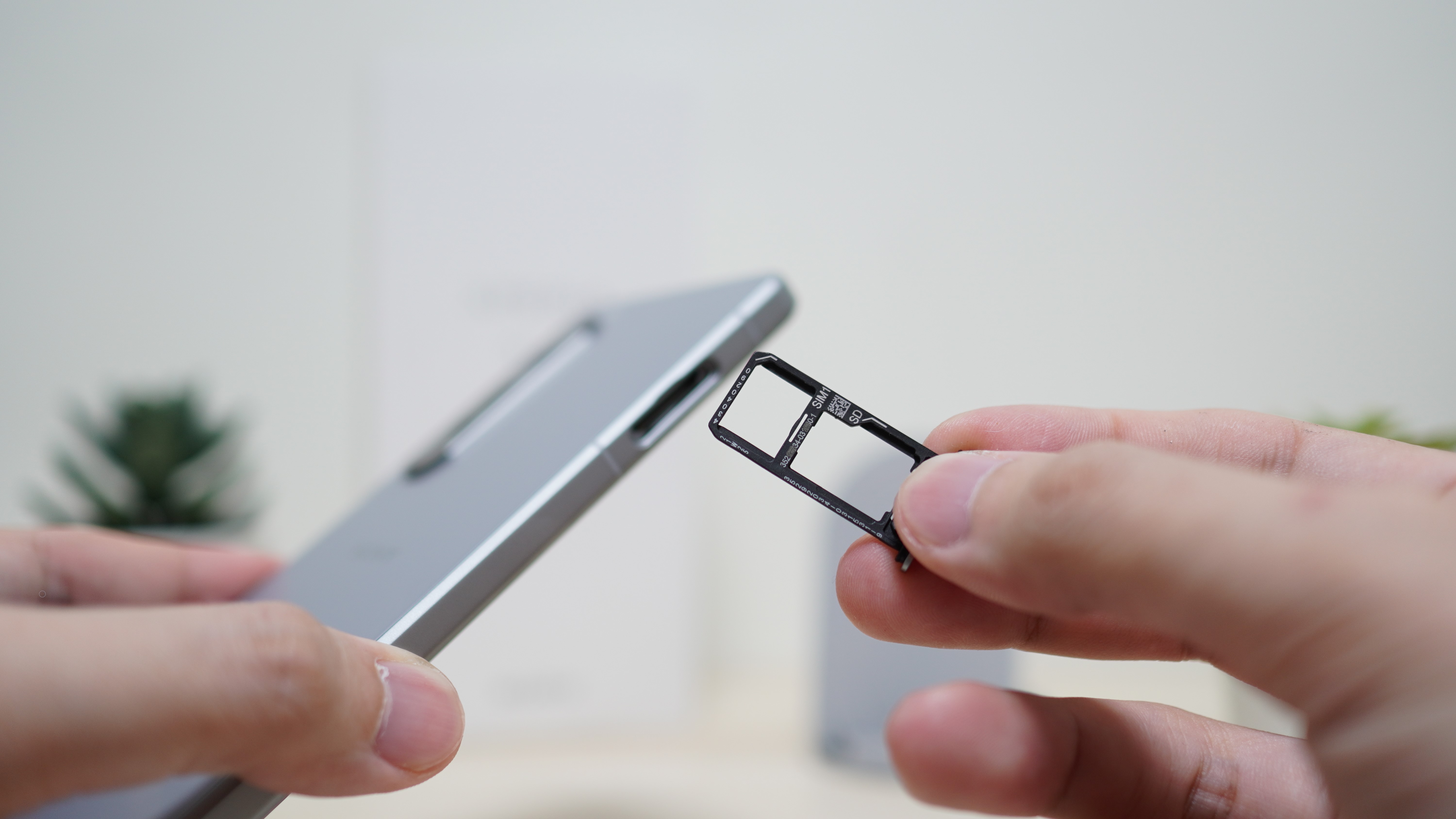 左側為SIM卡配置,採用不需要退卡針就能抽拔的二擇一卡托設計,能使用雙SIM卡(5G+4G 或 4G+4G)或單張SIM卡(5G或4G)搭配SD記憶卡(最大支援1TB)使用。