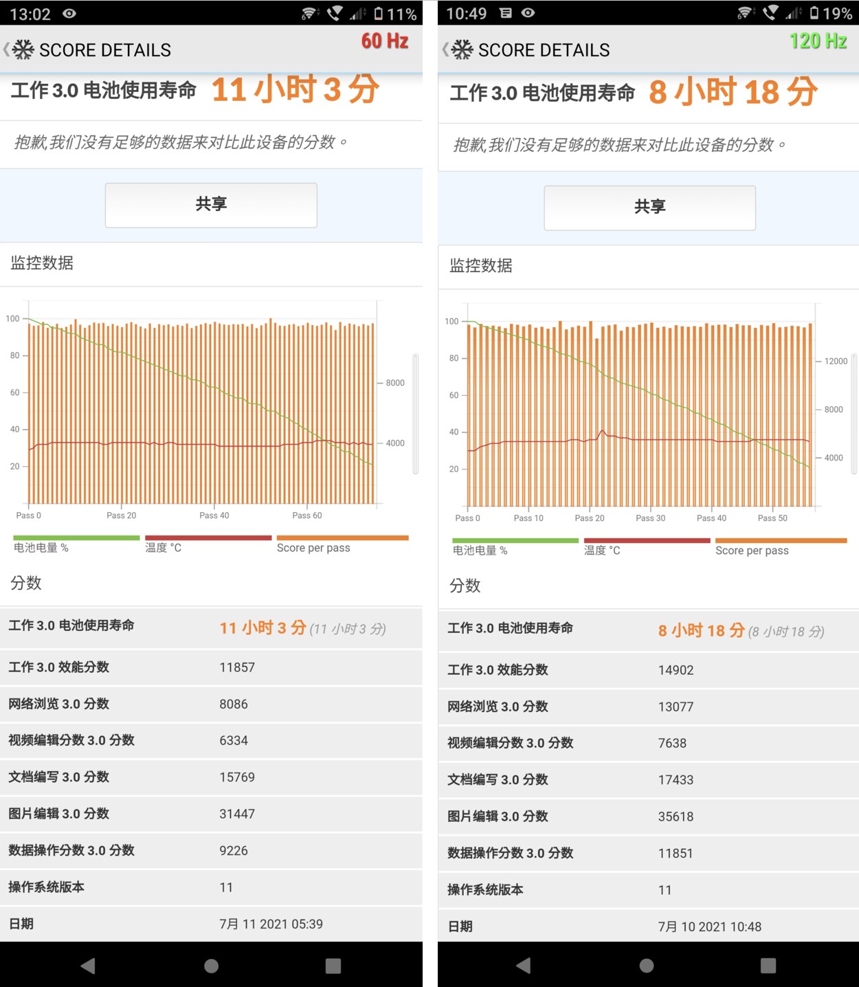 手機續航力表現透過軟體PC MARK進行測試,手機螢幕亮度使用Auto,電量為100% – 20%的測試時間,軟體測試時間畫面保持恆亮跑測試軟體,從畫面上看到 Xperia 1 III 採用螢幕更新率60Hz的時候為11小時03分,如果開啟120Hz則是8小時18分,因此一般方式正常使用從上班至下班加上來回通勤時間,基本上續航力還算足夠。