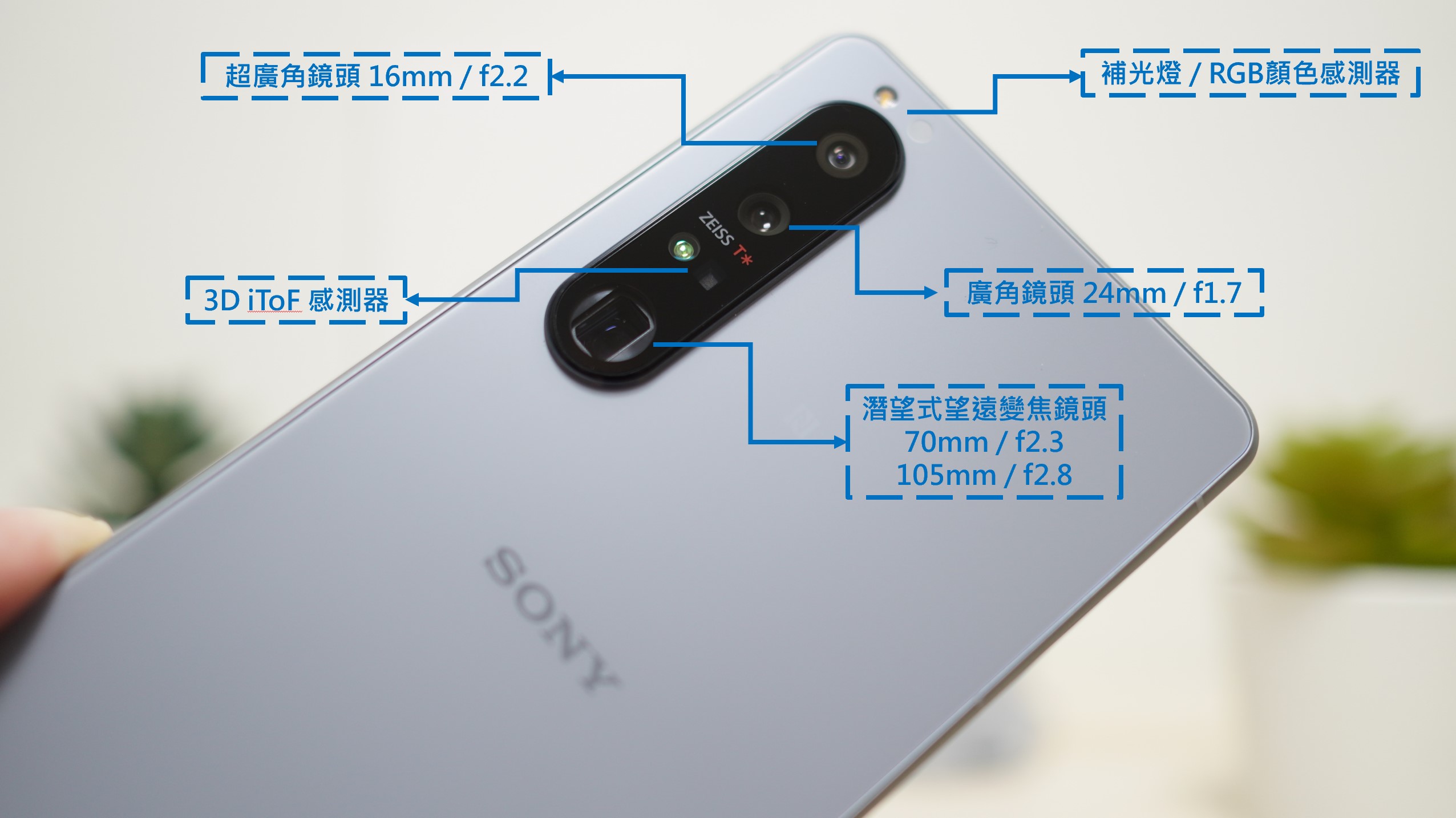 背面的 Xperia 1 III 三個相機鏡頭為蔡司光學協助調教,也有蔡司T* Coating增透及抗反射塗層,最特別的是最下面的潛望式望遠變焦鏡頭是全球首例結合Dual PD感測器的鏡頭,因此也能讓 潛望式望遠變焦鏡頭 實現快速對焦。