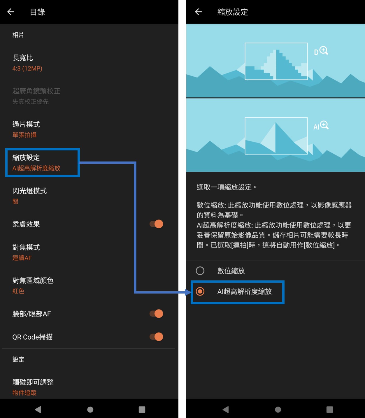 Xperia 1 III在相機介面的MENU裡還有一項優化拍攝功能AI超高解析度縮放,透過AI演算補強讓變焦拍攝時能優化拍攝畫質,不過此項功能預設是在數位變焦,因此建議使用這款手機相機要有良好的拍攝體驗可以把這功能開啟。