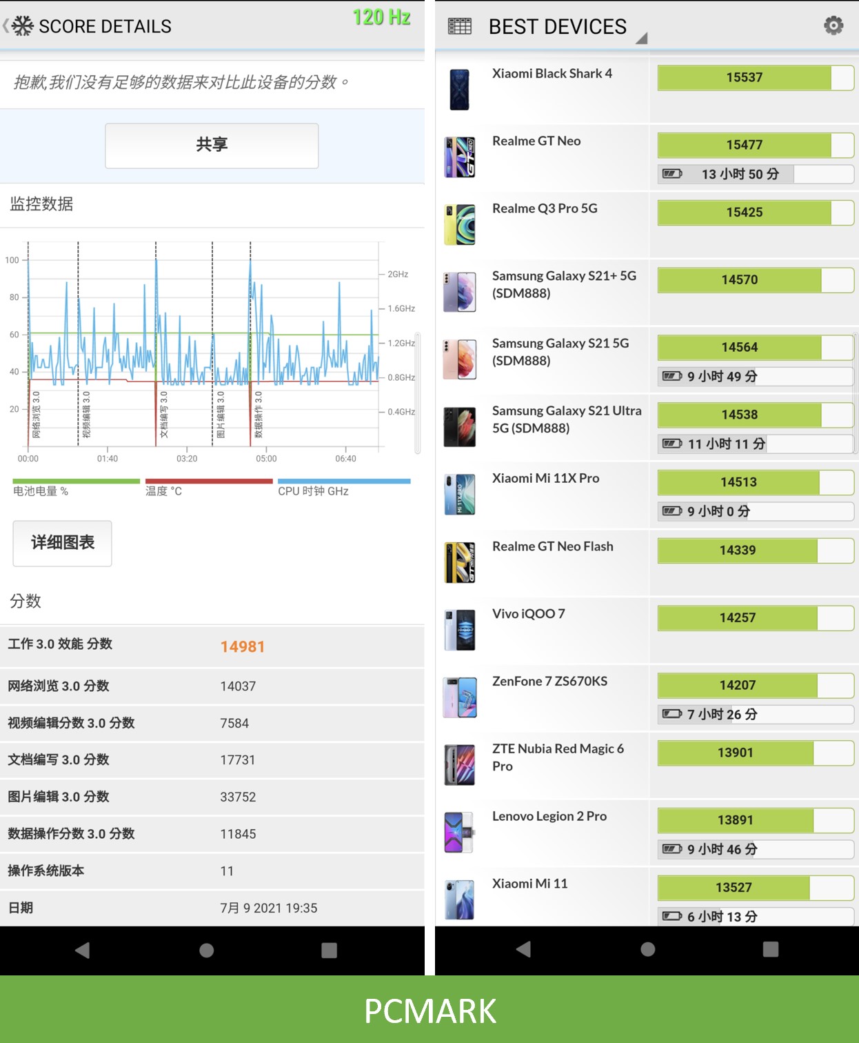 凱叔拿到的是常規「12G RAM+256GB ROM」版本,透過GeekBench5的跑分測試得到單核比較拿到1114分,多核比較拿到3609分;透過PCMARK進行工作效能跑分得到14981的分數,基本上與同樣使用相同 高通驍龍S888 的機種分數相近。