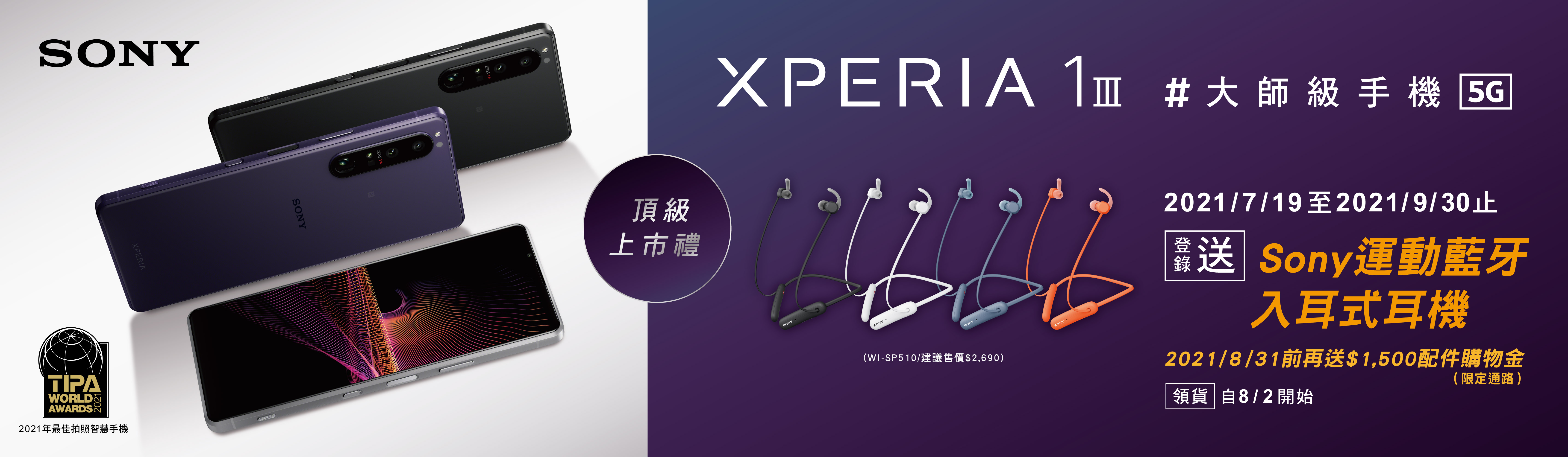 大師級5G旗艦手機Xperia 1 III承蒙廣大索粉支持,Sony Mobile貼心規劃的「上市首購禮活動」,至2021年9月30日止,凡至全台各手機販售通路,包含實體門市、線上購機、電信通路,不論單機選購或是搭配優惠資費方案,選購任一款Xperia 1 III大師級5G旗艦手機,上網完成登錄即可獲得Sony運動藍牙入耳式耳機(WI-SP510,市價2,690元)。