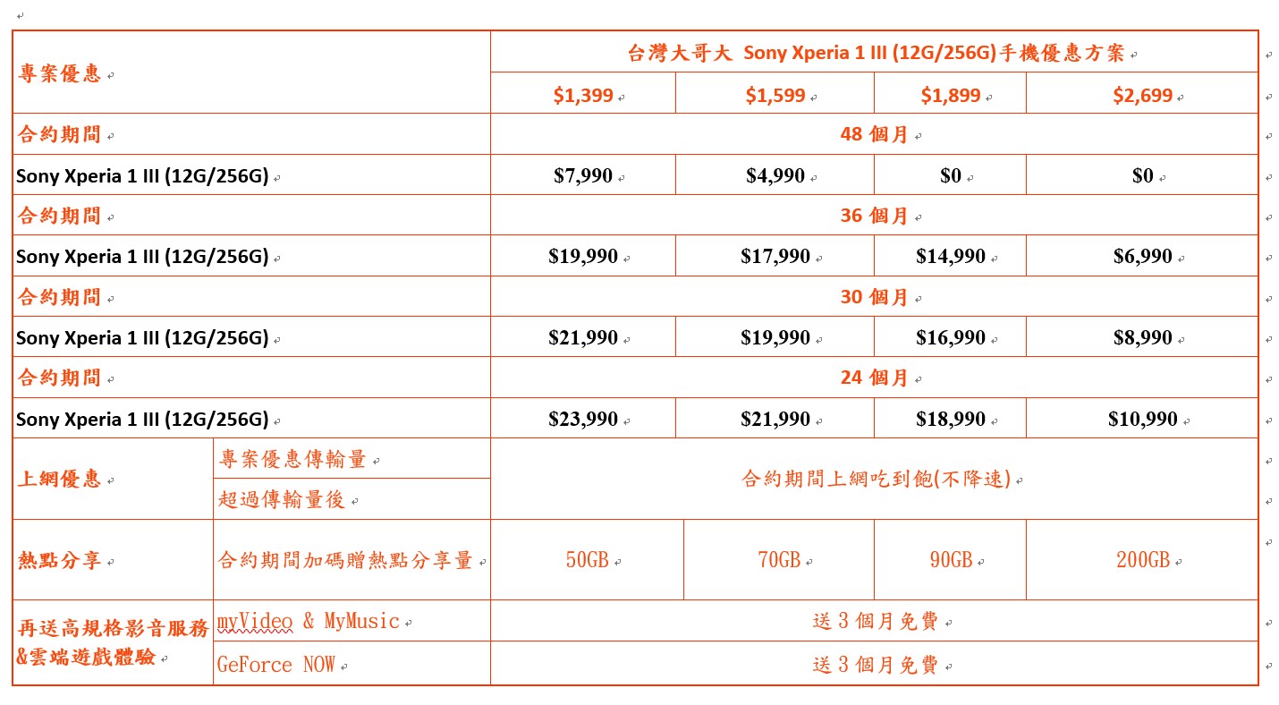 - 分期0利率優惠:於Sony Mobile行動通訊專賣店,購買Xperia 1 III享刷卡分期0刷卡分期零利率優惠,每月輕鬆付!