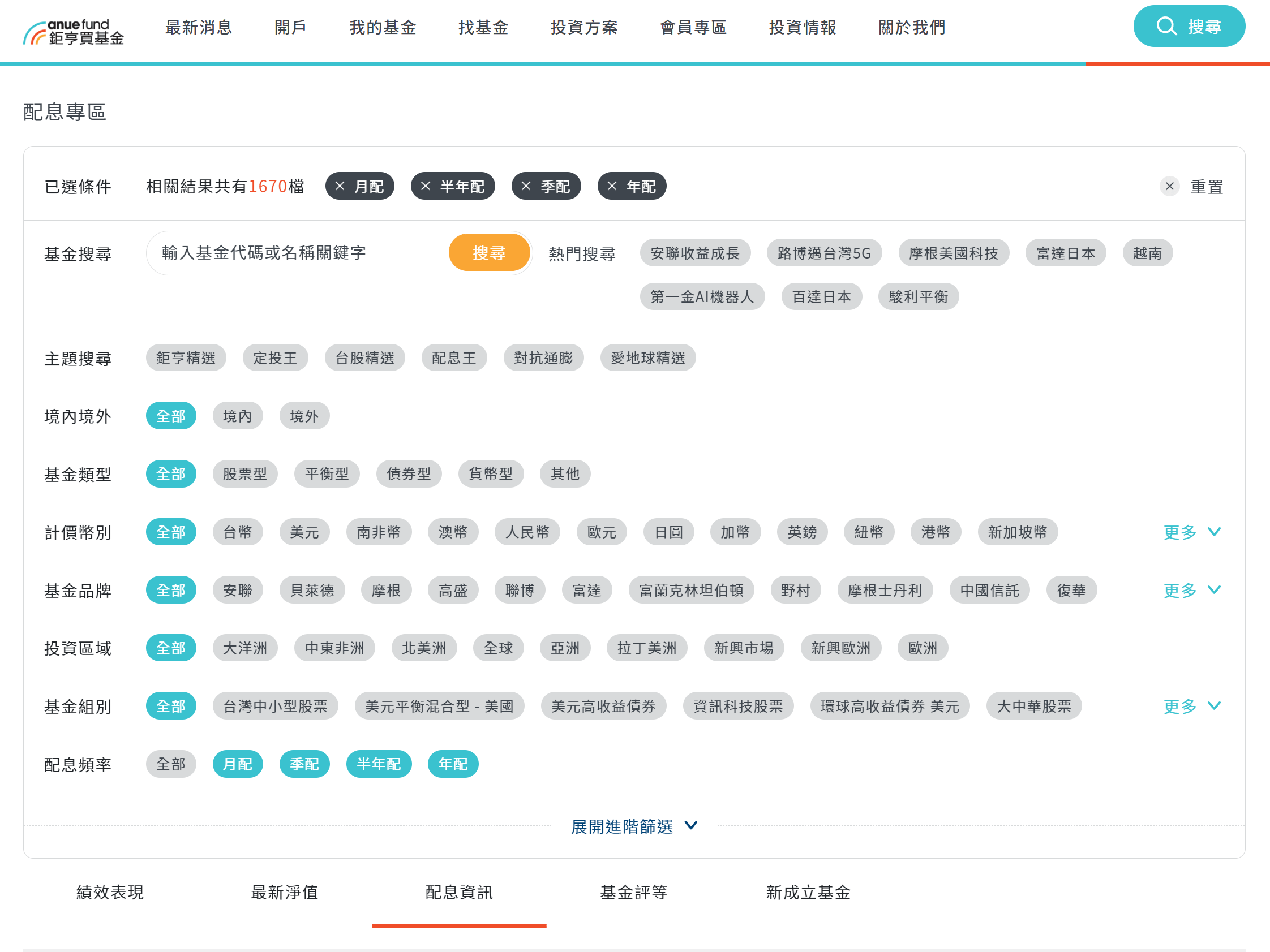透過在鉅亨買基金的網站上可以「基金系列」的「配息基金」來查詢基金標的物的資訊。