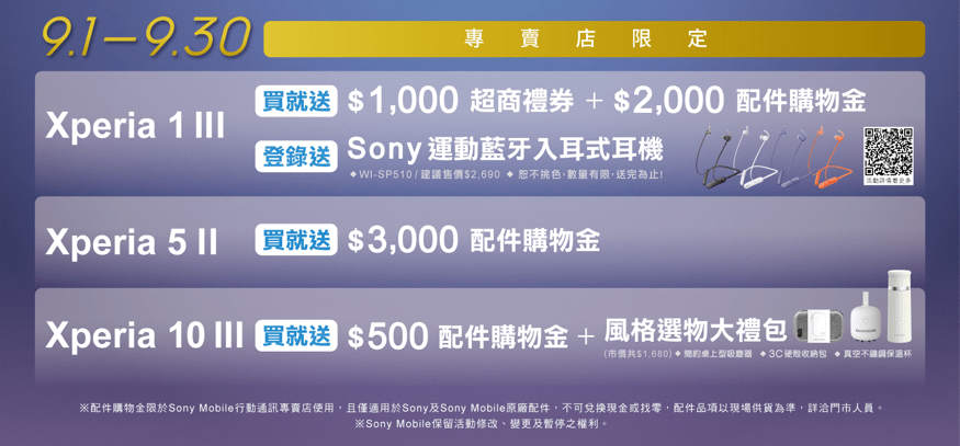 活動期間凡至Sony Mobile行動通訊專賣店購買Xperia 1 III,配件購物金增加為2000元,再加送1,000元超商禮券,上網完成登錄再送Sony運動藍牙入耳式耳機WI-SP510 (建議售價2,690元)。