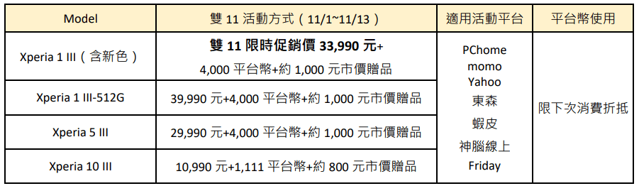 Sony Mobile也規劃精選線上通路平台,推出雙11促銷方案,活動期間(11/1至11/13止),至精選線上通路平台,包含:PChome購物、Momo購物網、Yahoo奇摩購物中心、蝦皮購物(Sony 官方授權旗艦店)、東森購物、神腦線上、friDay 購物等指定通路,選購大師級手機Xperia 1 III,將享有限時促銷價33,990元(原參考建議售價36,990元),以及4,000平台幣+約1,000元市價贈品;選購玩美合手旗艦機Xperia 5 III,買就送4,000平台幣+約1,000元市價贈品;選購萬元防水夜拍機Xperia 10 III,立即享有1,111平台幣+約800元市價贈品。