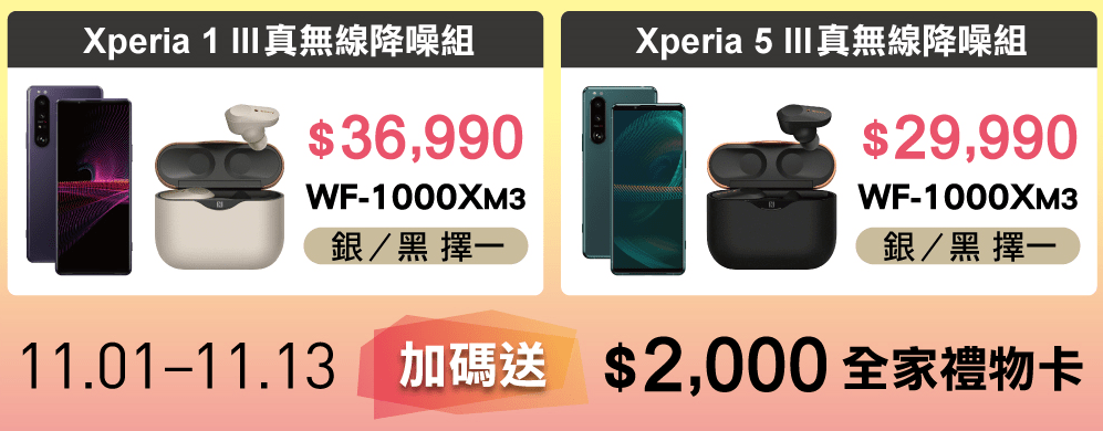 Sony台灣官方購物網站以及全台Sony Store直營店,雙11活動期間,同步推出Xperia 1 III以及Xperia 5 III真無線降噪組,兩款降噪組合內含WF-1000XM3真無線耳機一只,活動期間再加贈2,000元便利商店禮物卡。