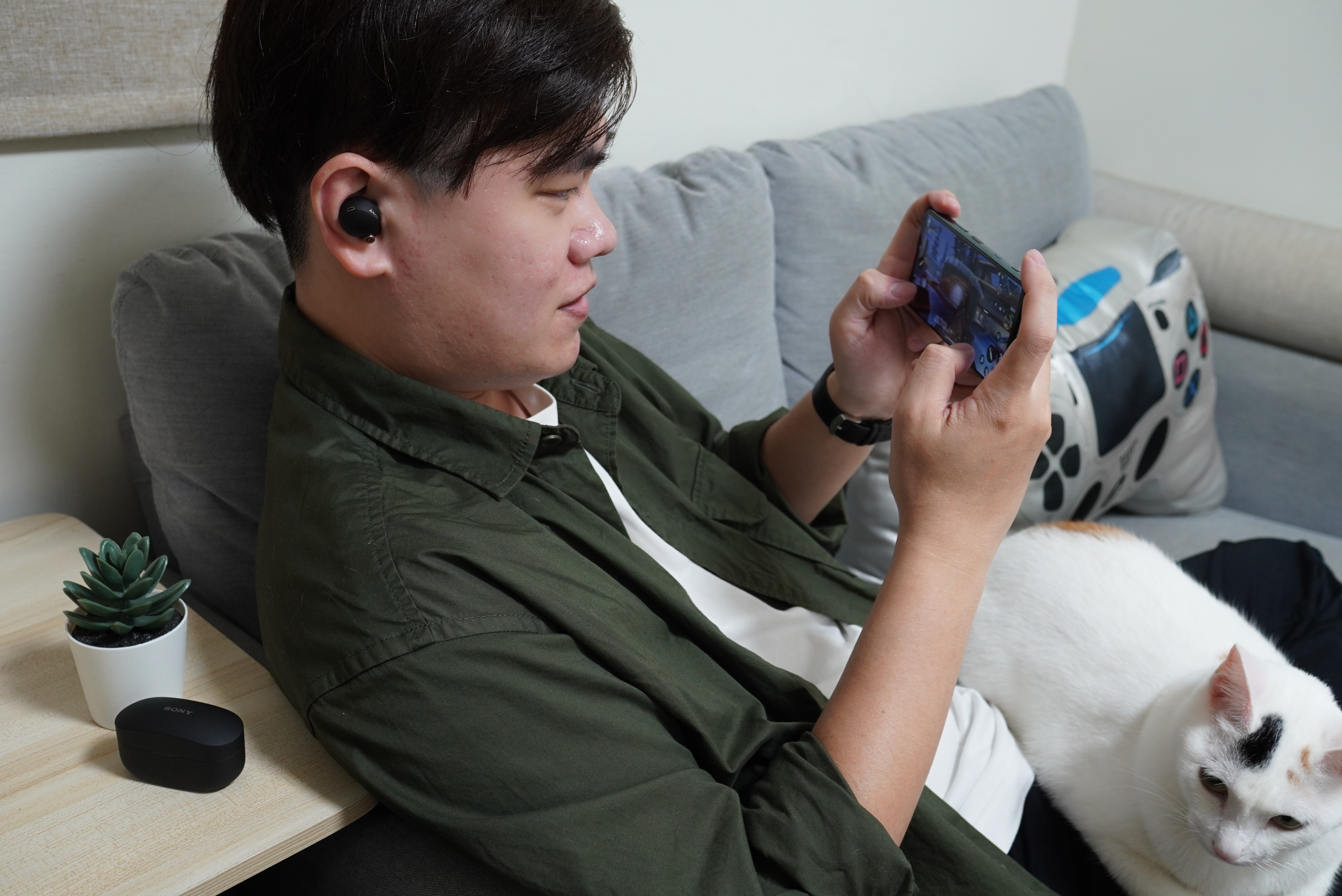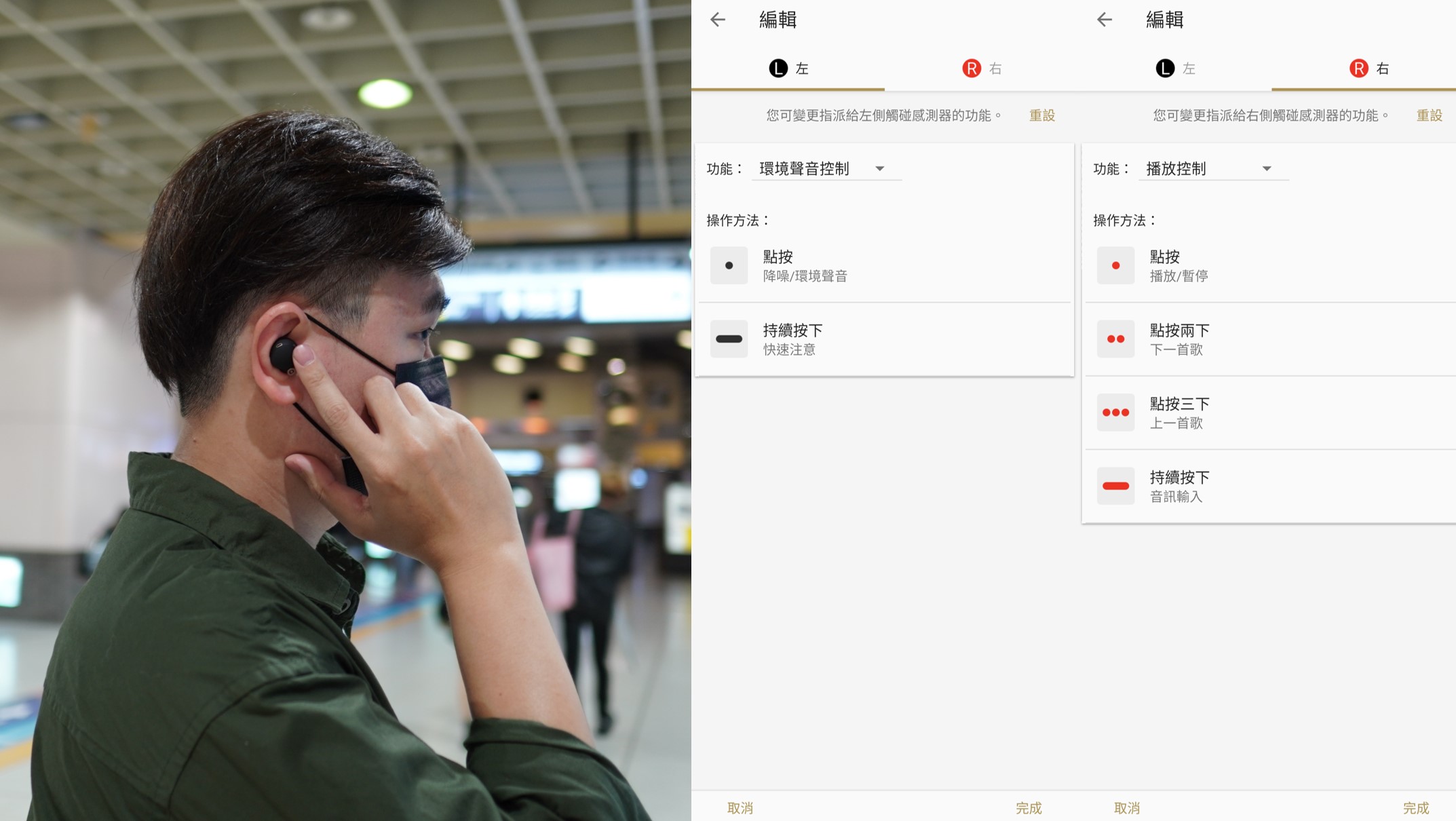 耳機操作的部分則是觸控腔體表面,預設值左耳是「環境聲音控制」,右耳是「播放控制」,也可依照個人喜好做調整,WF-1000XM4也是款可以單耳使用的真無線藍牙耳機。