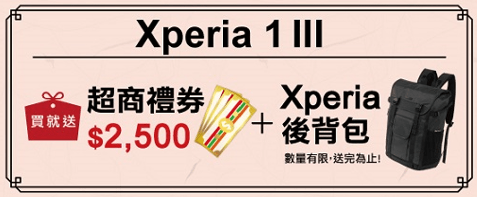 活動期間凡至Sony Mobile行動通訊專賣店購買Xperia 1 III,不僅可獲「Xperia酷黑後背包」,再送2,500元超商禮券!(數量有限,送完為止)。