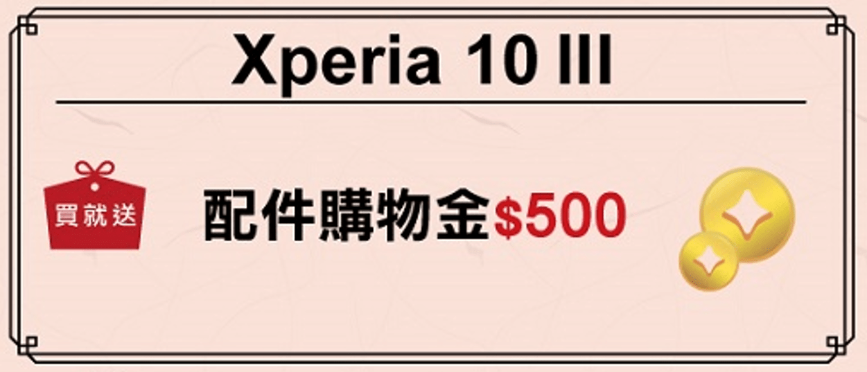 活動期間凡至Sony Mobile行動通訊專賣店購買Xperia 10 III,買就送配件購物金500元。