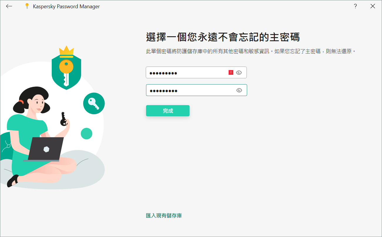 這邊凱叔要特別提醒,當使用 Kaspersky Password Manager 這項功能時,你必須先自訂一組主密碼,這組主密碼是密碼管理器的鑰匙,跟我的卡巴斯基帳會員號密碼是分開的,記得別搞混囉!