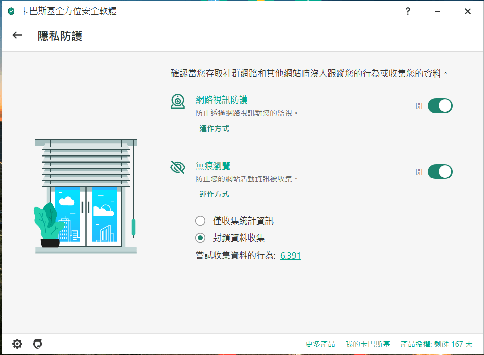 同時大家注重的「個人隱私」卡巴斯基全方位安全軟體也顧慮到了,透過「隱私防護」幫你在電腦的視訊鏡頭多設一道關卡保護,避免遭受惡意軟體竊取控制的不當使用。