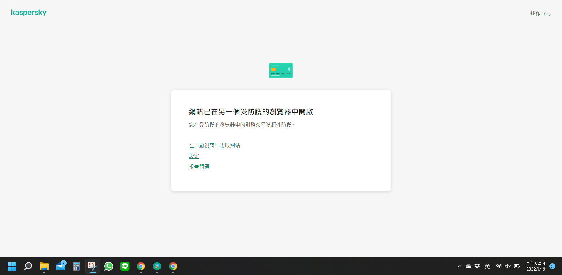 當你進入加到Safe Money功能中的網站,卡巴斯基全方位安全軟體會幫你跳轉到防護的瀏覽器開啟。