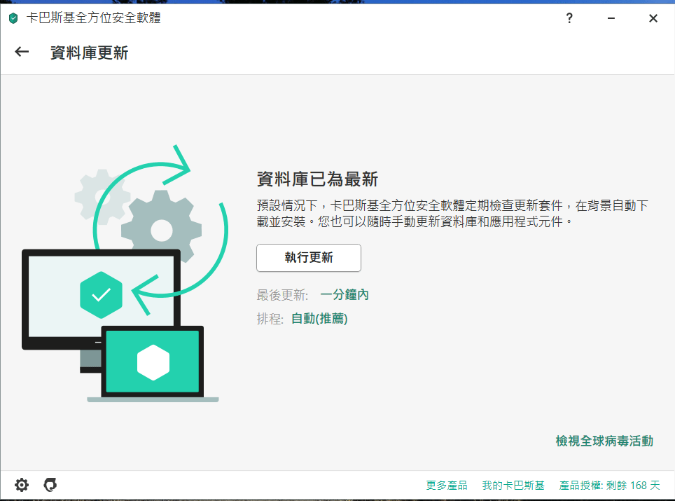 卡巴斯基實驗室具有龐大的病毒數據資料庫及病毒搜尋引擎,因此在防毒軟體使用前請先進行資料庫的數據更新,讓自己的電腦有最新的病毒數據資料來達到最佳防護效果。