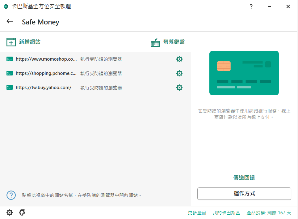 現在許多人會使用電腦進行網路購物及金融交易等行為,為了避免在交易過程中遭到網路犯罪分子攻擊,你可以透過卡巴斯基全方位安全軟體中的Safe Money,把常用的金融交易軟體加到裡面,幫助你在金融交易過程受到保護免受虛假網站的侵害。