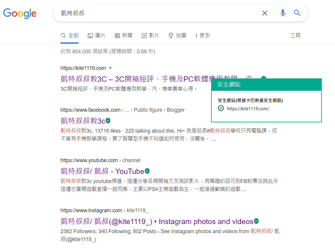 如果你要進入的網站跟凱叔的網站一樣是綠色盾牌,那就代表在卡巴斯基的數據資料庫是安全網站,看到紅色盾牌就代表該網站是危險的,就別執意進入避免受害。