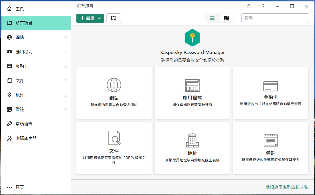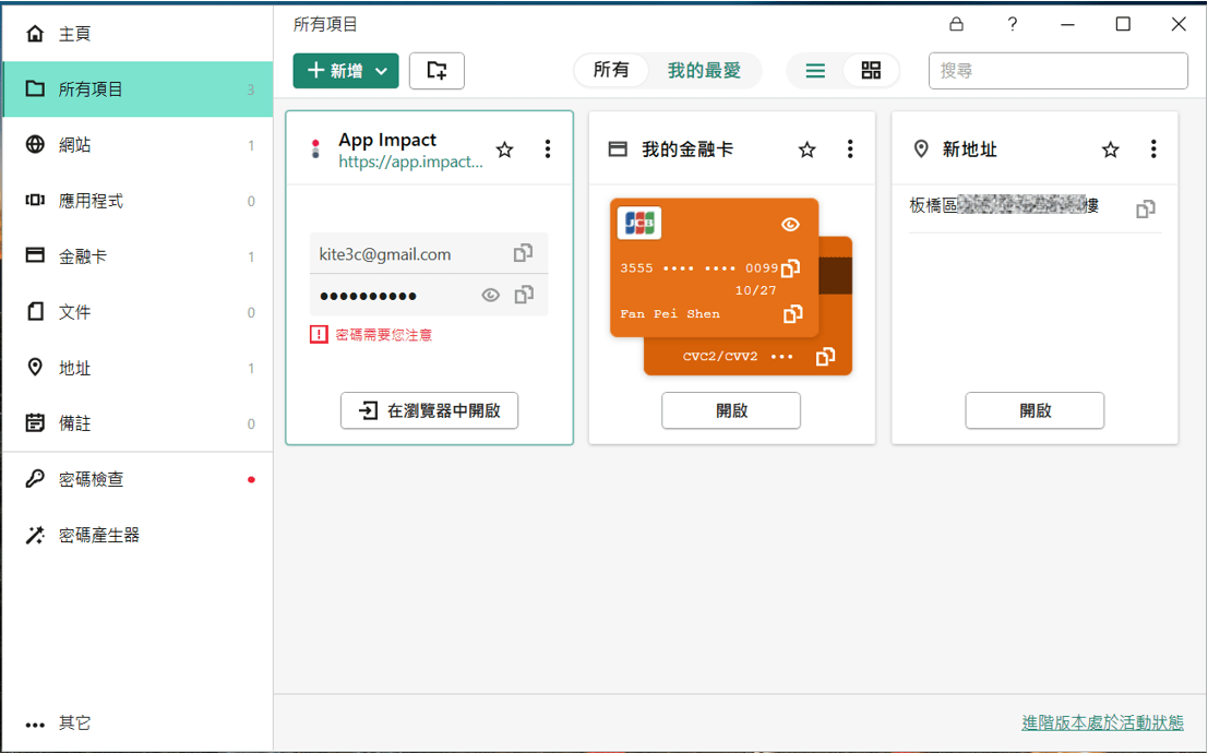 當你有輸入上述項目相關的資訊,就會看到 Kaspersky Password Manager 跳出可以直覺辨識的卡片式管理,使用上能夠快速上手。