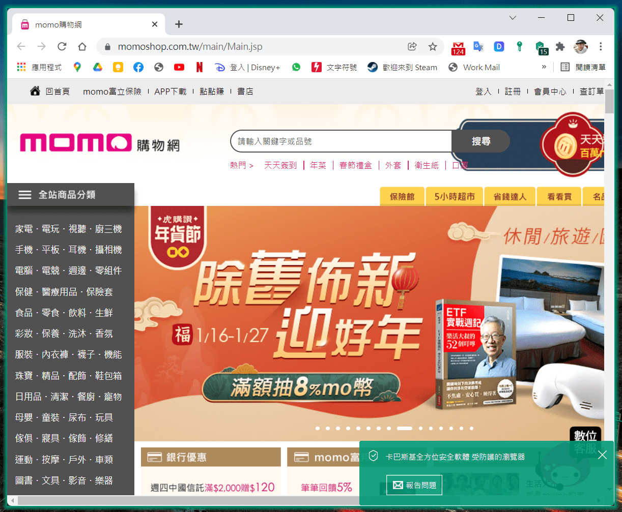 凱叔把常用的購物網站加到 Safe Money,開啟就會跳到有綠色框框的防護瀏覽器頁面,螢幕右下角會跳出受到卡巴斯基全方位安全軟體 防護的瀏覽器做提示,讓你使用金融交易或虛擬貨幣交易時能多層防護,使用上相對安心。