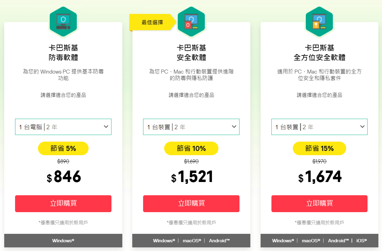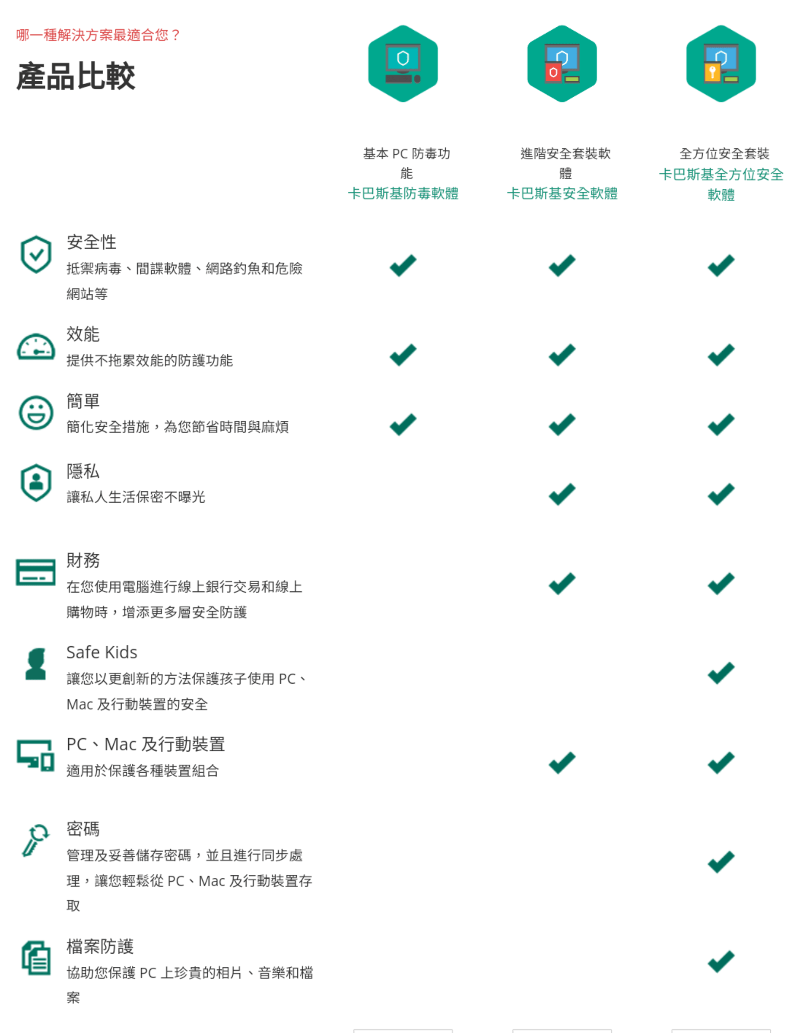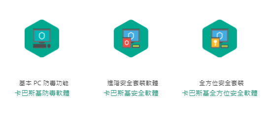 在卡巴斯基實驗室網站上有許多防毒軟體版本提供用戶選擇,基本上可以分為三大類,依照使用需求可做挑選。