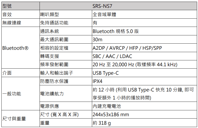 此外,配備IPX4防潑水規格則提高機體耐用性以及更廣泛的使用方式,搭配長達12小時的電池續航力, SRS-NS7絕對是日常生活最可靠的影音生活良伴。
