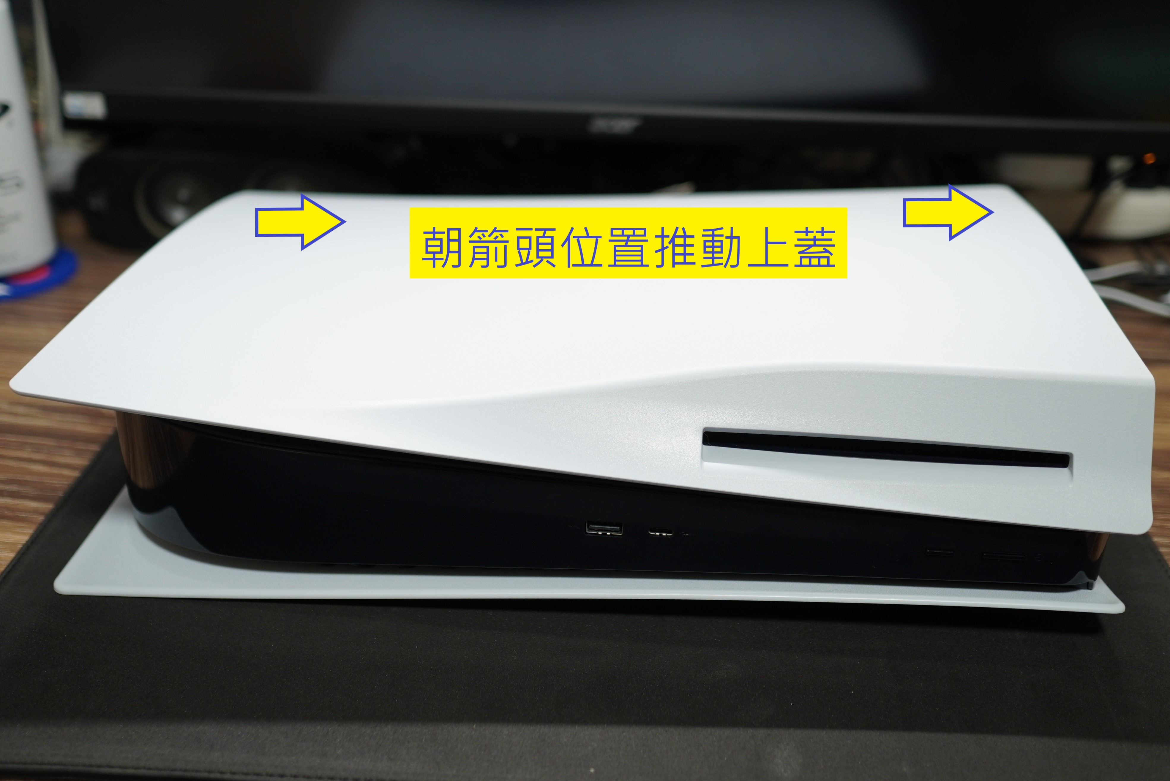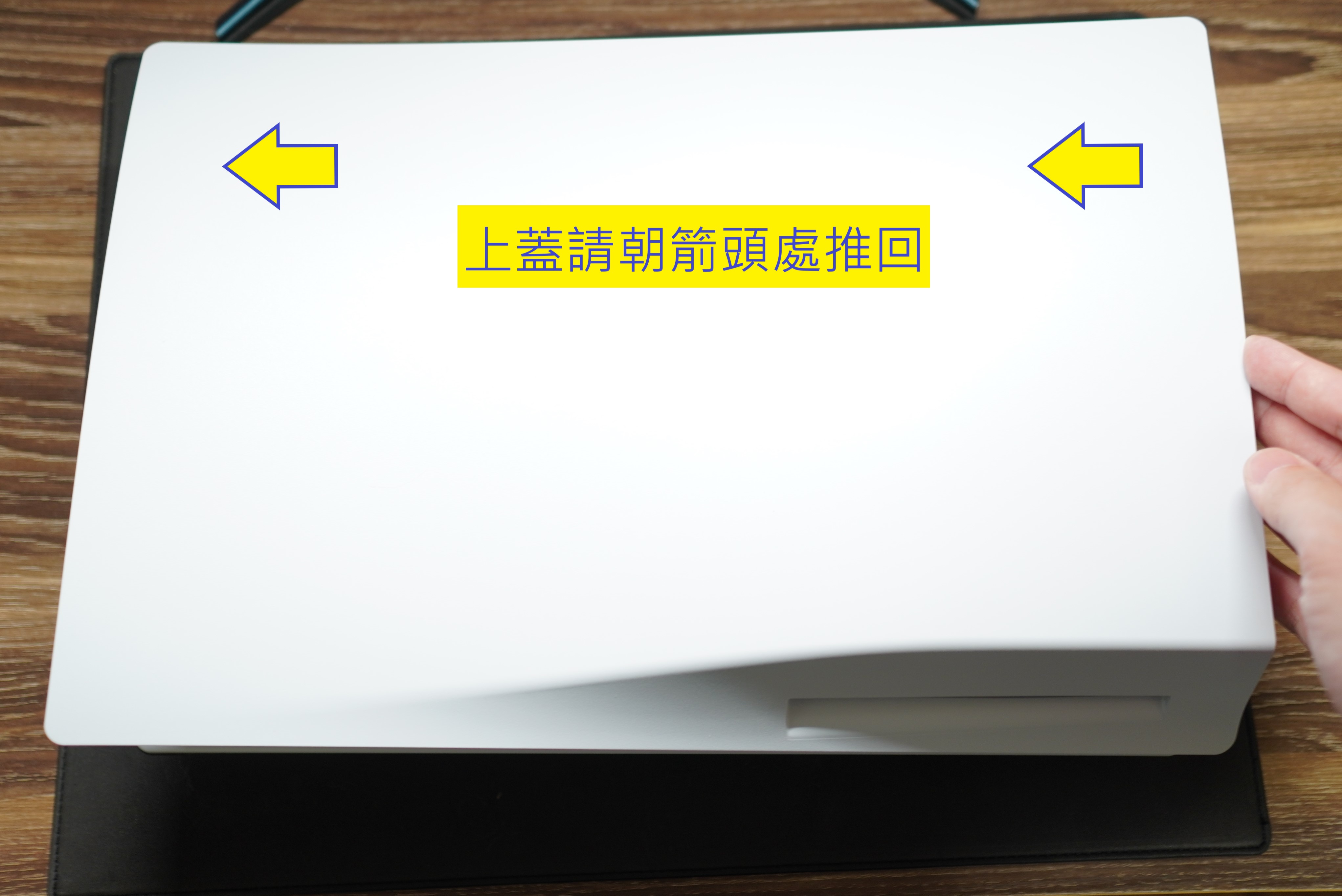 下一個步驟請拿塊墊子讓PS5橫躺,避免放在下方的背蓋刮傷,接著朝圖片中的箭頭方向推動你的主機殼的側蓋(面對主機電源鍵的右邊側蓋)。